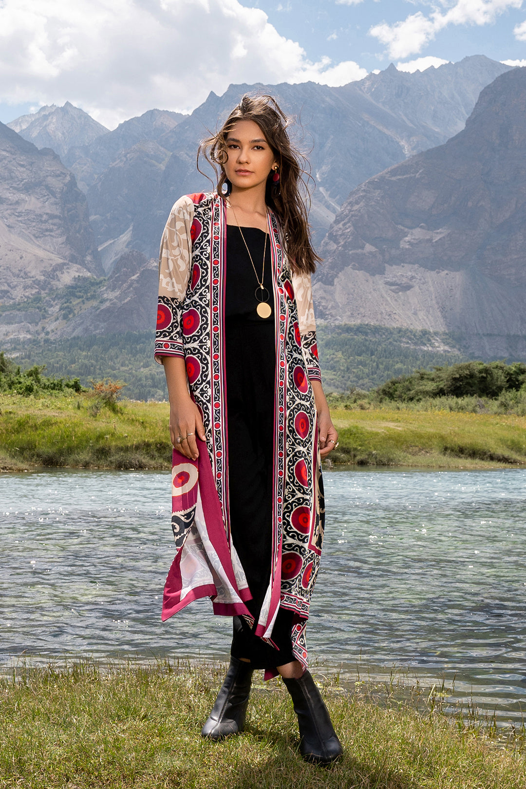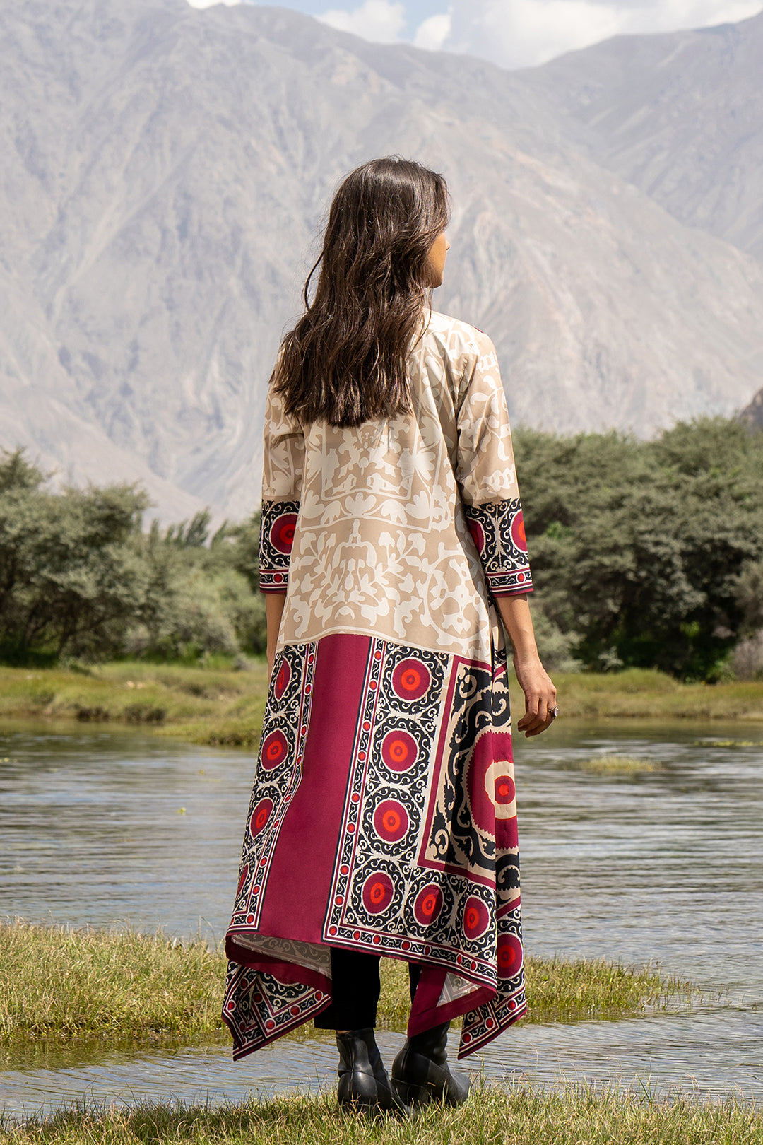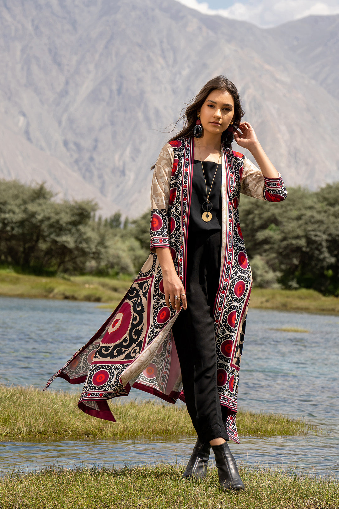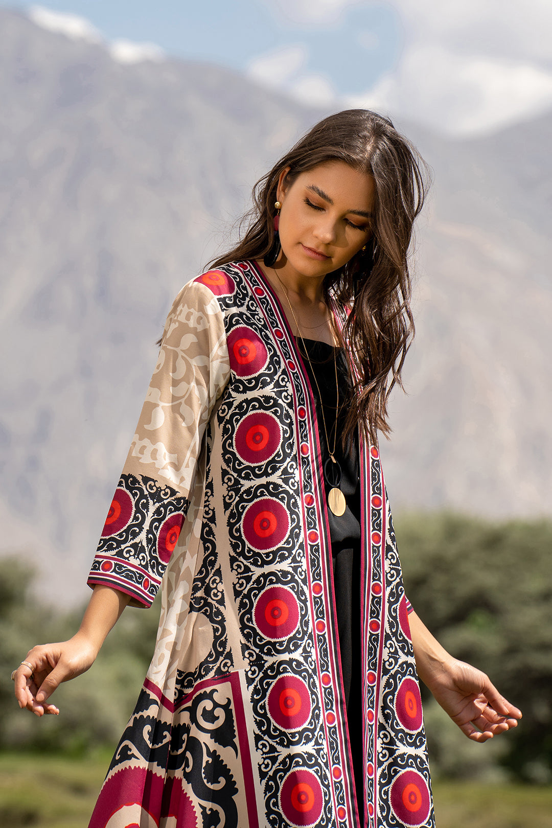 This shurg made in ethnic print features a front-open silhouette, three-quarter sleeve length and side slits. It can be paired with our "Black Tapered Pants" and "Black Tank Top" to complete the look. Length 46". Model is wearing small size. Model height 5'6".