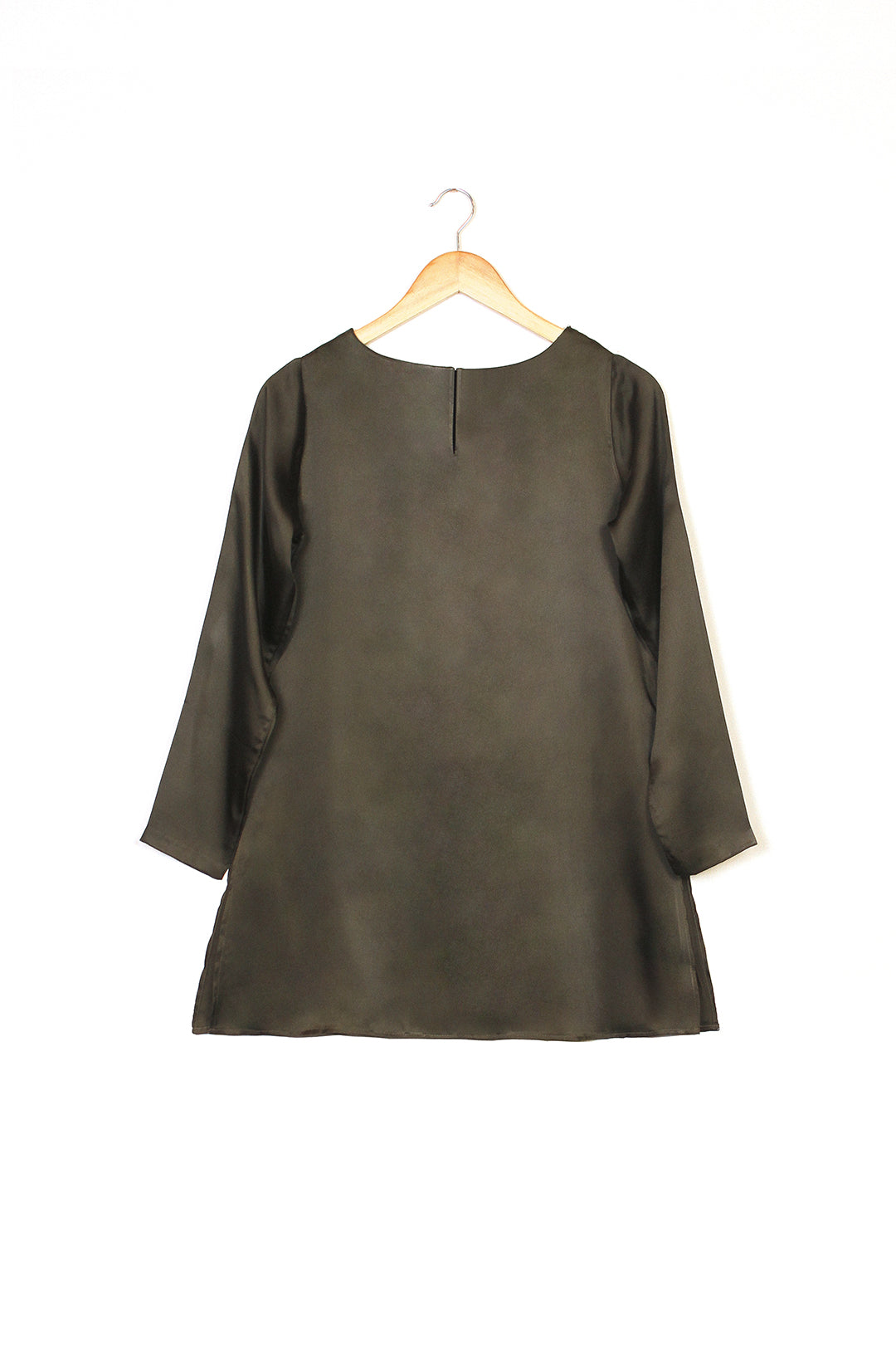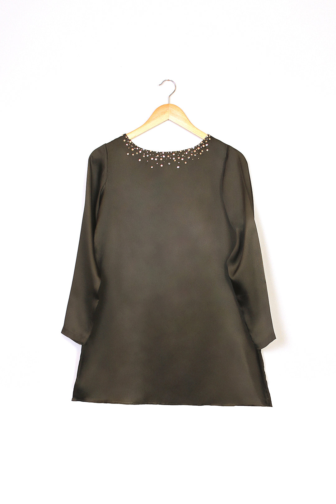This olive green charmeuse silk top features an embellished neckline in gold and champagne crystals. Pair with "Aaliaar Jacket" and "Aaliaar Pants" to complete the look.