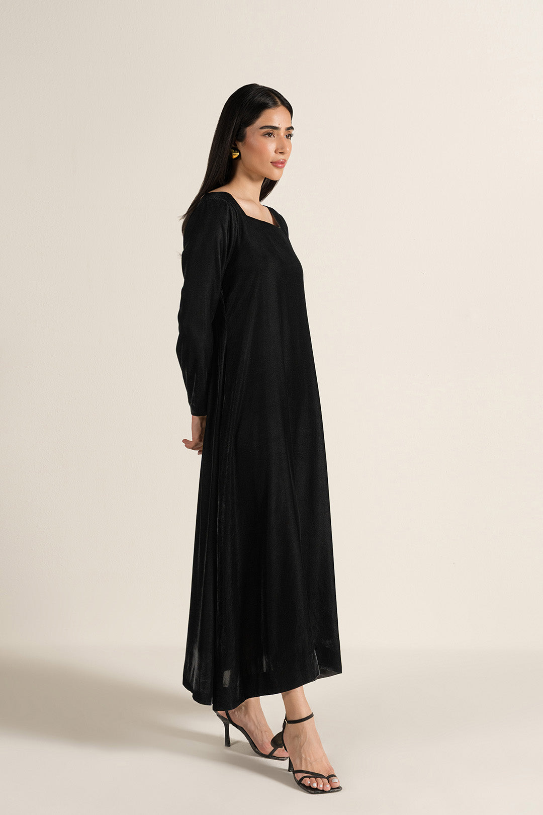• Crafted in soft velvet, this article features a square neckline, straight full-length sleeves, and an A-line silhouette for an elegant look.
