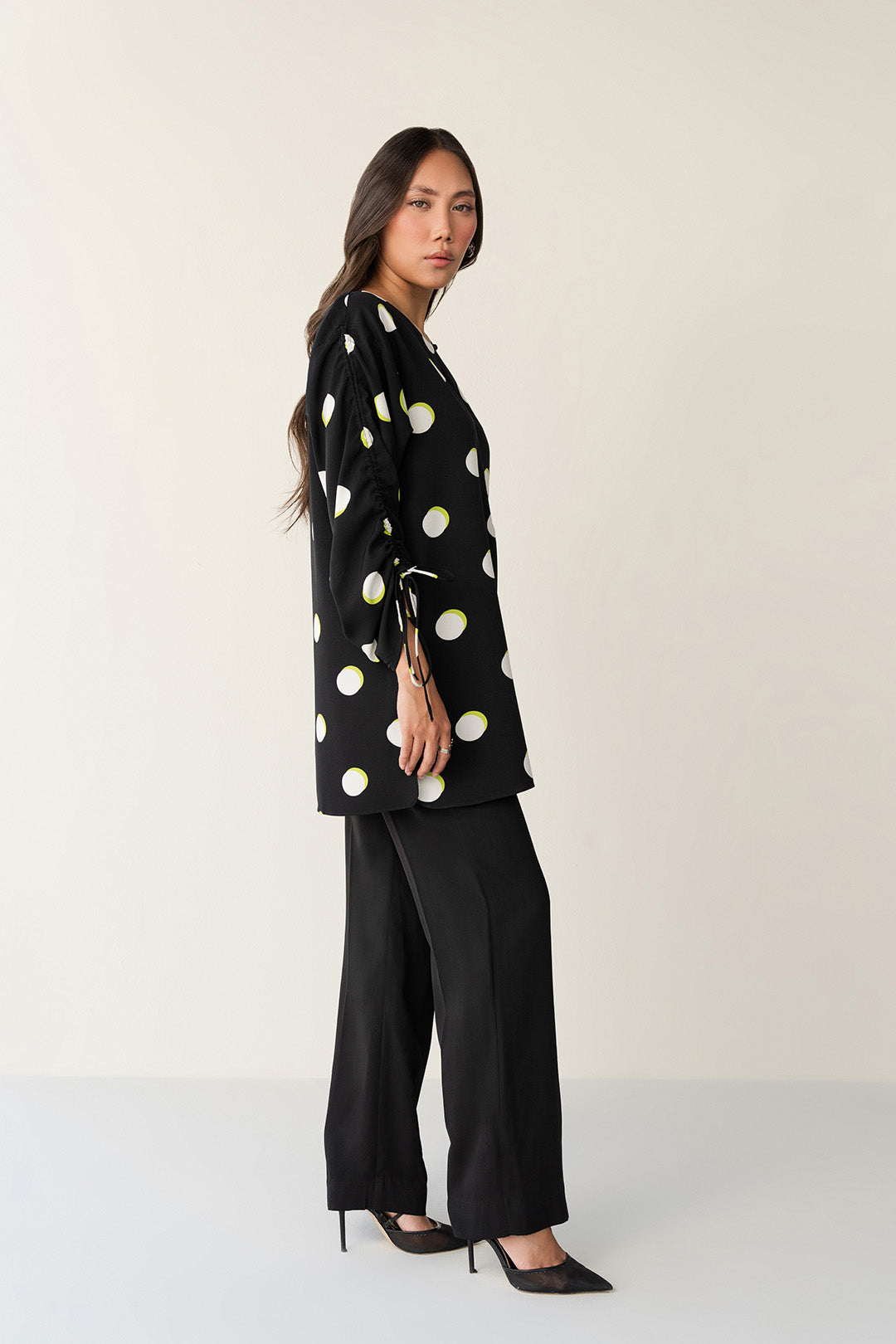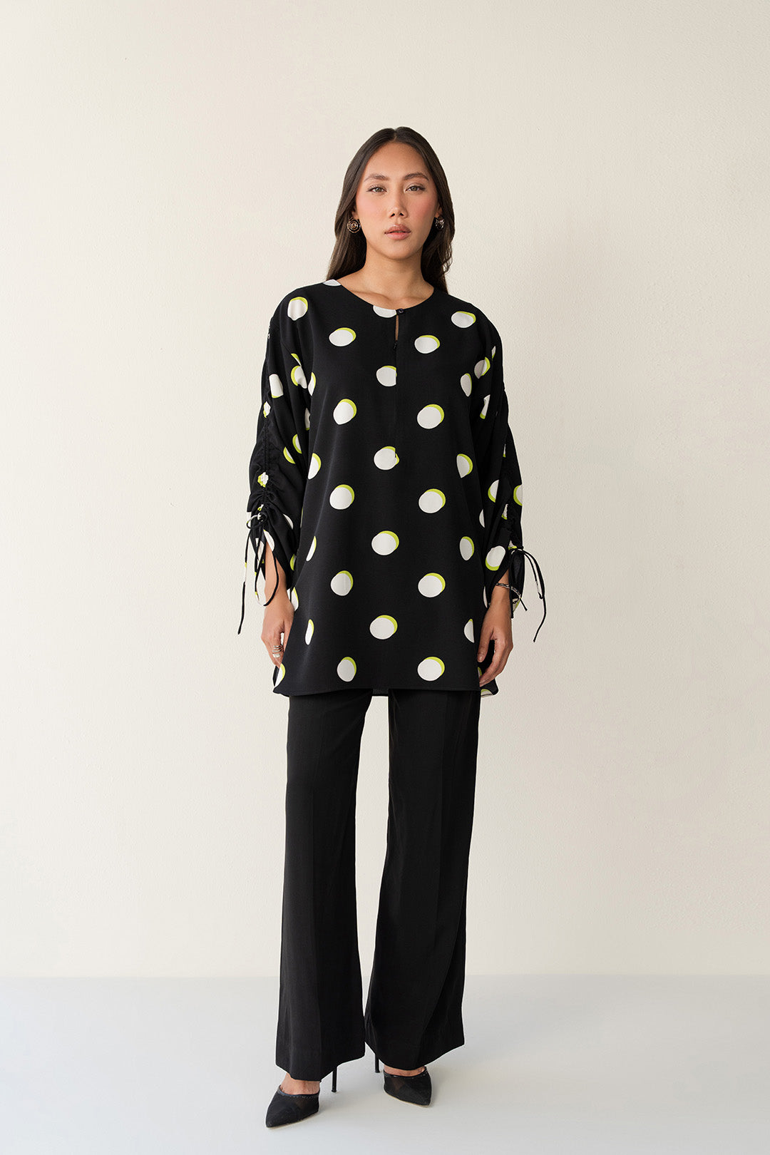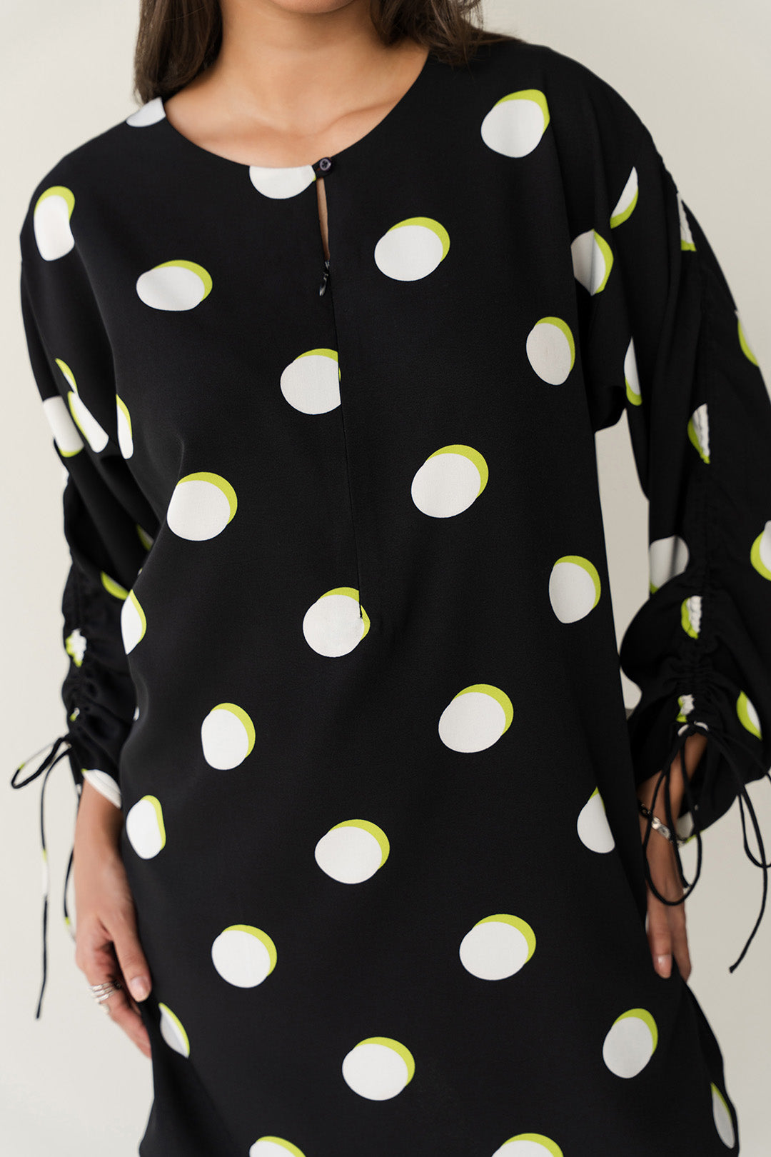 Crafted in soft crepe with a polka dot pattern, this top features a crew neckline with a slit and zipper opening.