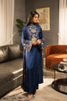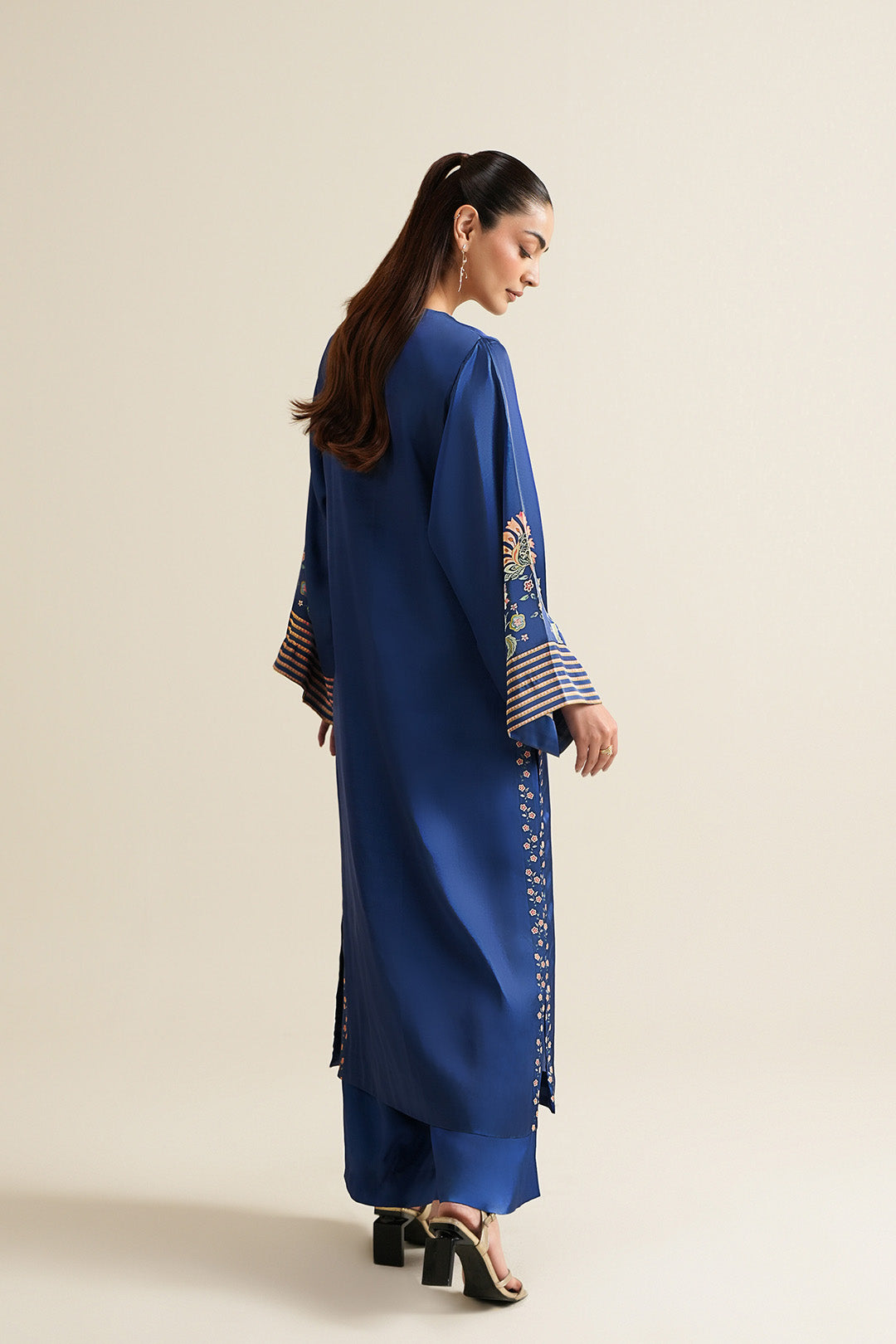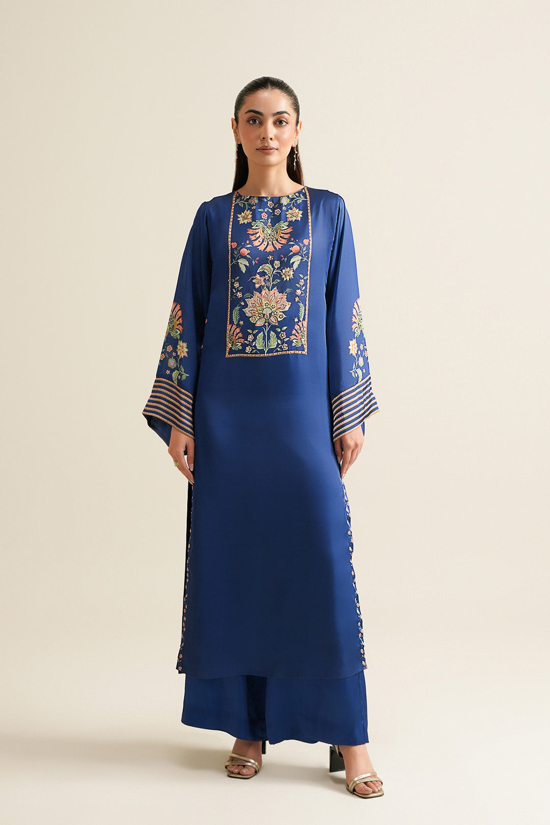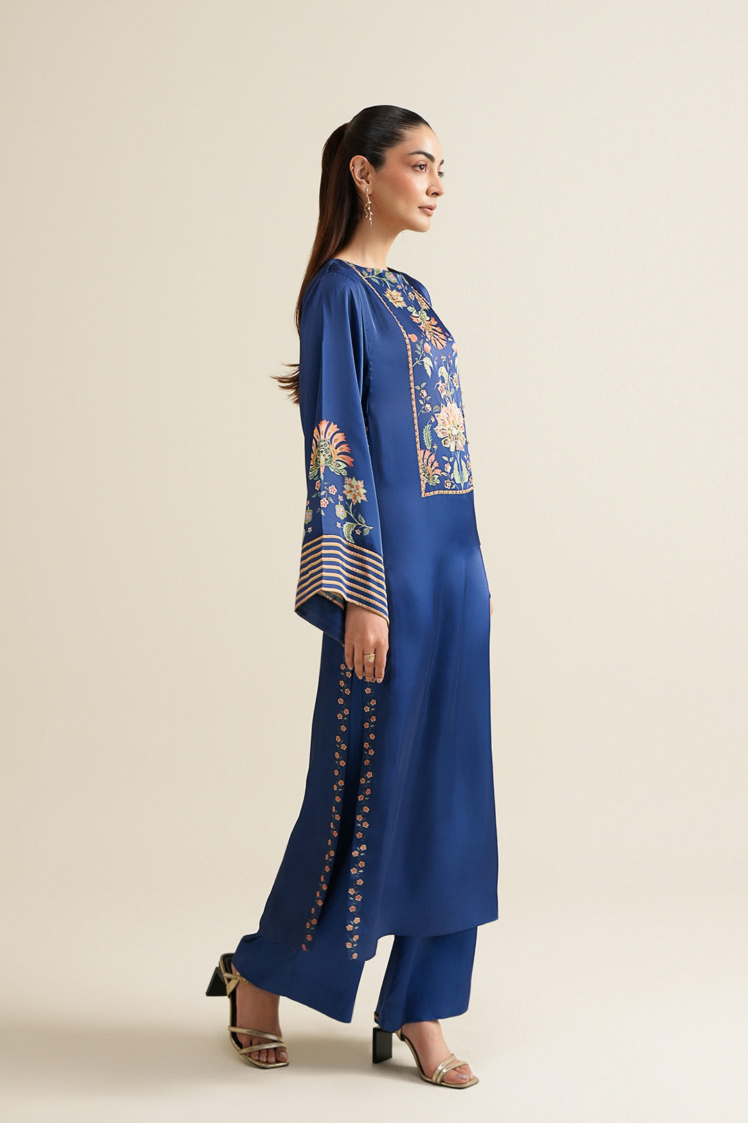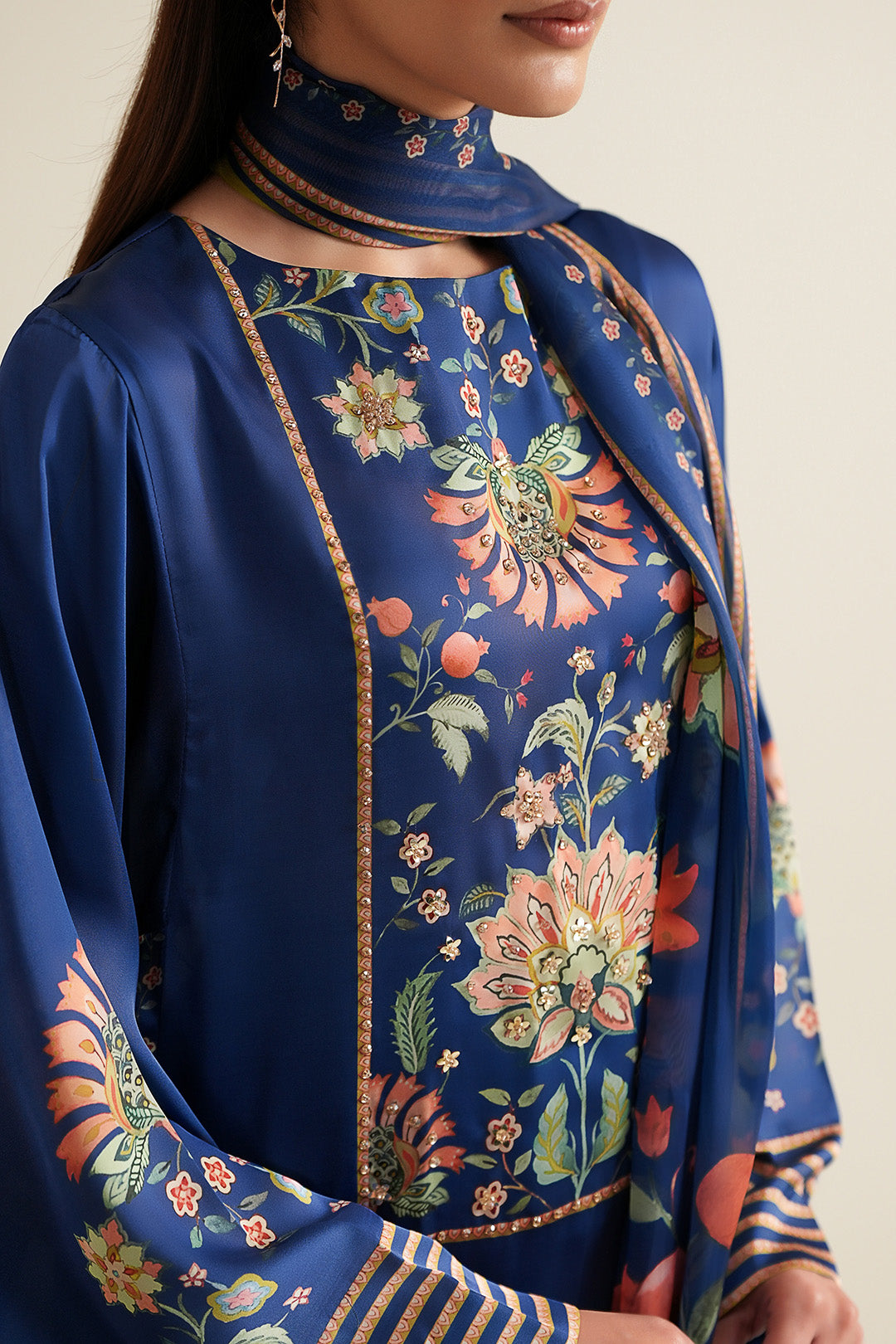 This cobalt blue top made in floral printed charmeuse silk fabric features a crew neck with back neck slit, hook & eye closure, square armholes and side slits. This top is adorned with crystals and sequins on the front neck.