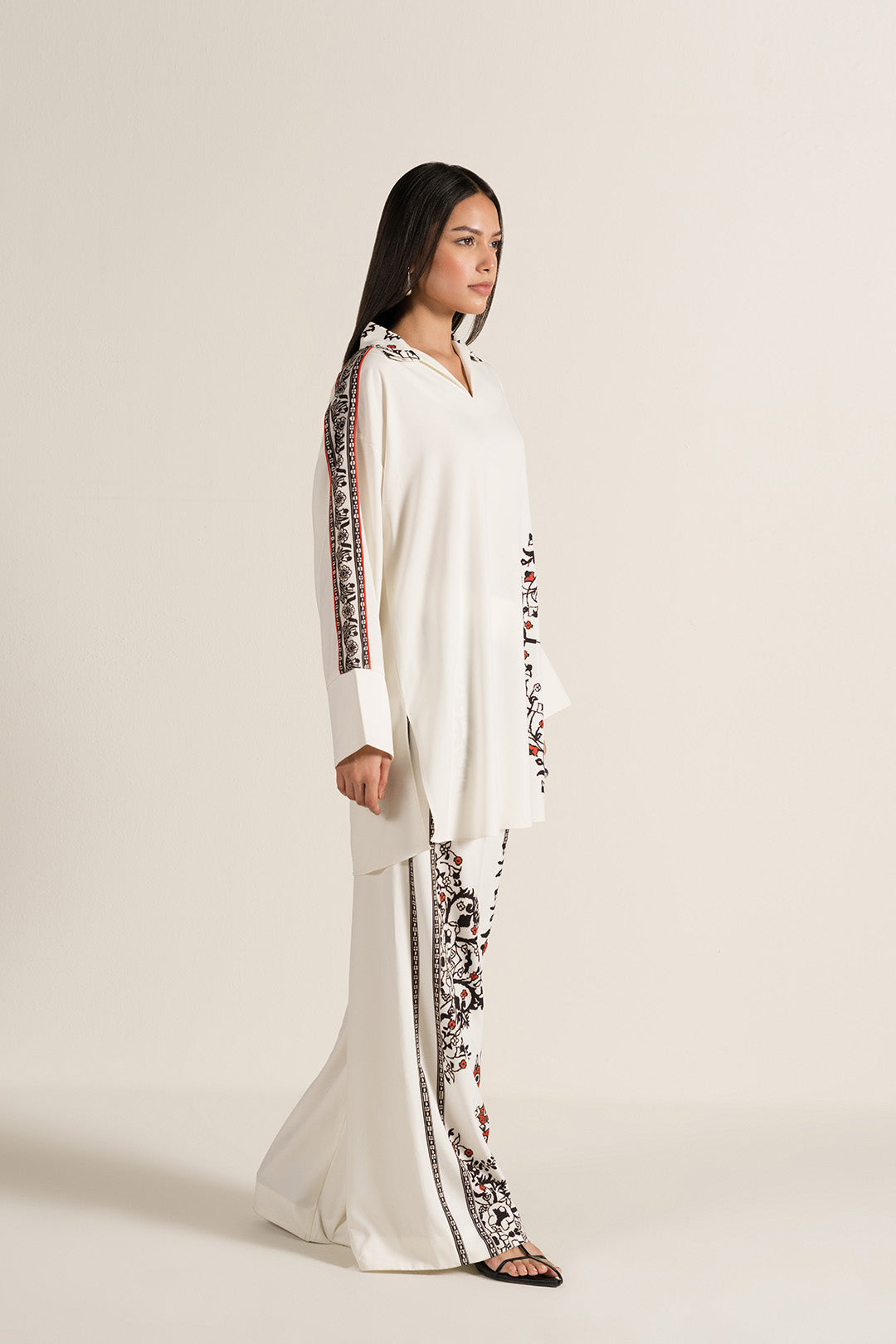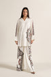 • Crafted in soft printed crepe, this top features a one-piece collar with a V-neck opening. Designed with dropped shoulders, full-length sleeves, slit detailing at the cuffs, and loop-button closures for a refined, elegant finish.