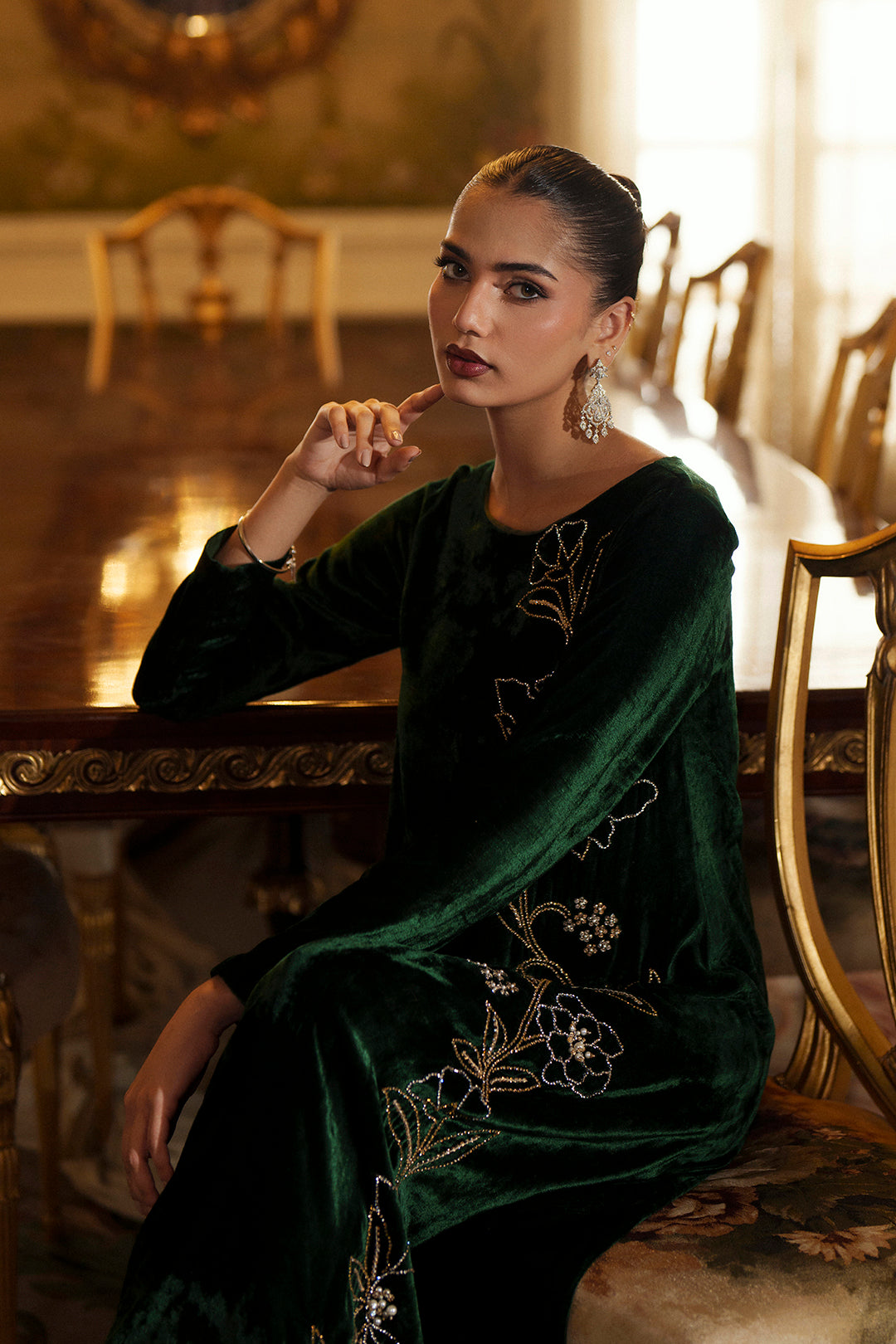 • This bottle green velvet dress is not one to miss, with crystal embellished florals running down its length, this is a perfect addition to your closet. Pair with "Azun Stole" to complete the look.