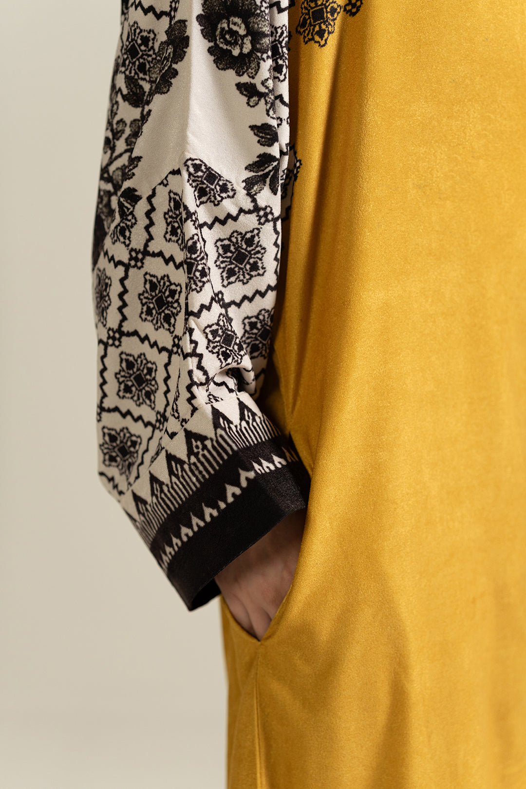 Crafted in soft printed velvet. This article features a refined boat neckline and clean seams at the center front and center back with top stitch detailing. Designed with batwing sleeves, functional side pockets, and low side slits for ease and movement.