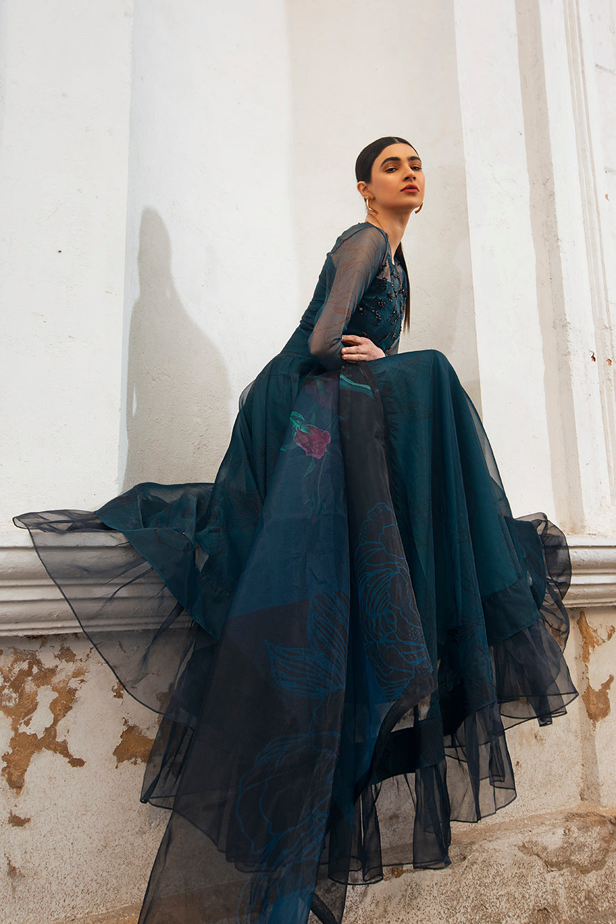 This crop top made in sheer organza fabric and soft crepe lining, features black crystal and sequin emballishment, crew neck and full sleeves . Bairi crop top comes with a skirt made in sheer organza fabric in a floral print with soft crepe lining, features a flared silhoutte with ruffled organza panel on the hem. Skirt length 46". Crop top length 16". Model is wearing small size. Model height 5'7"