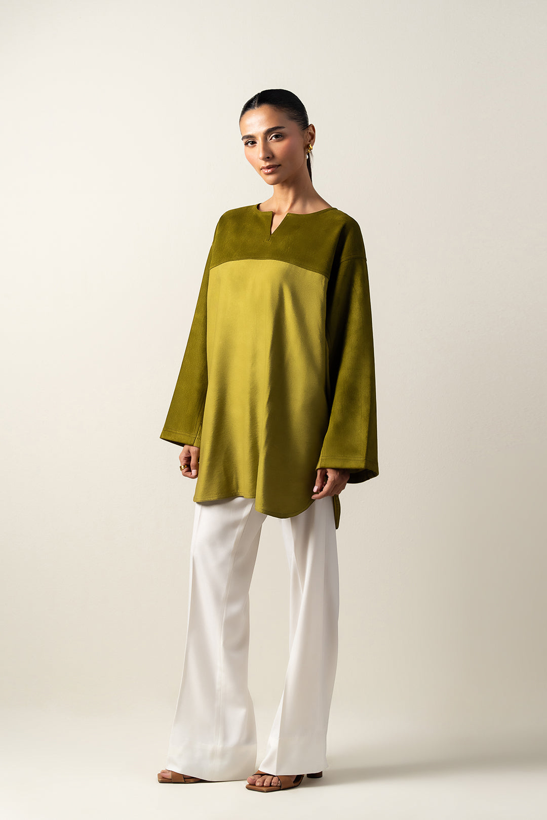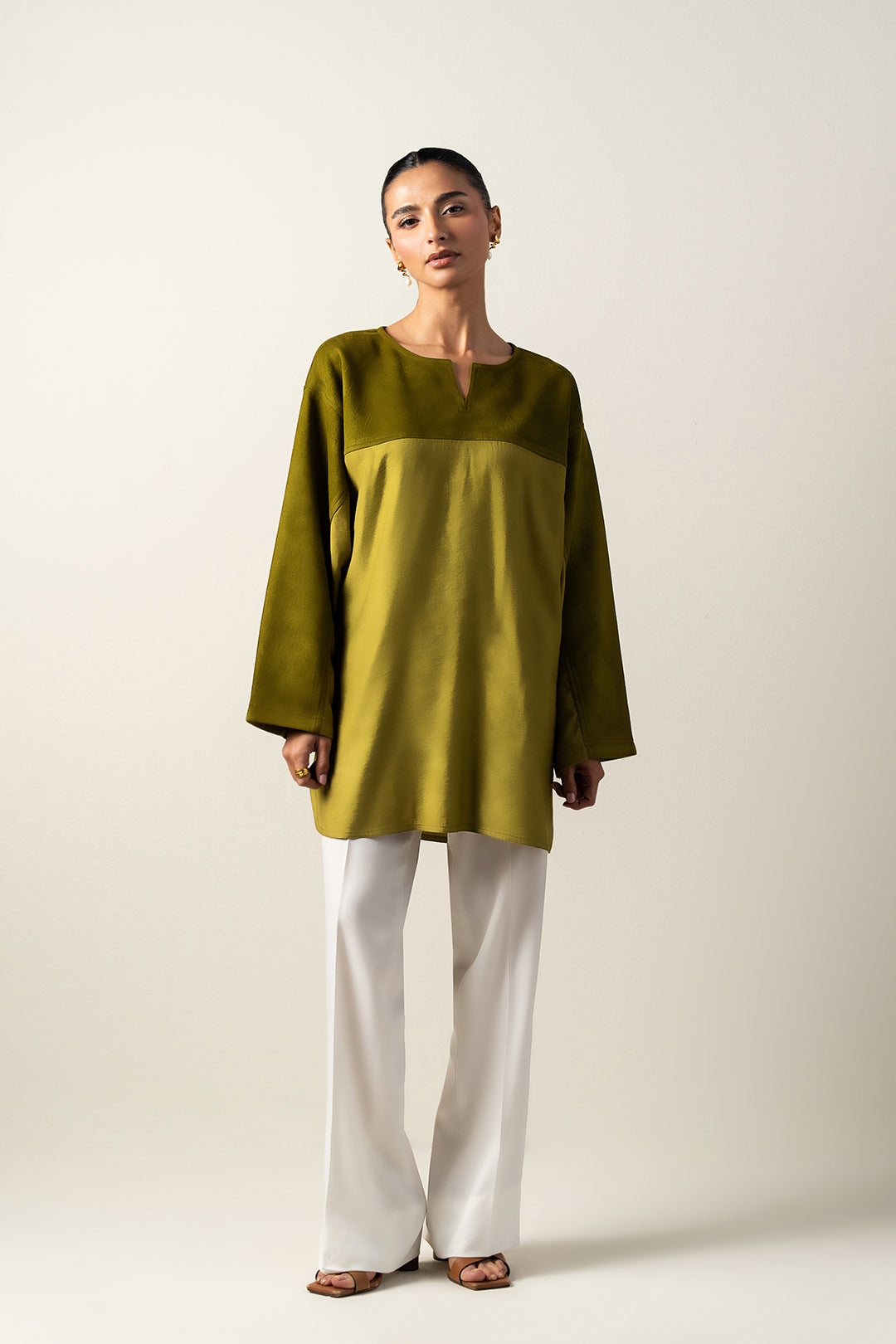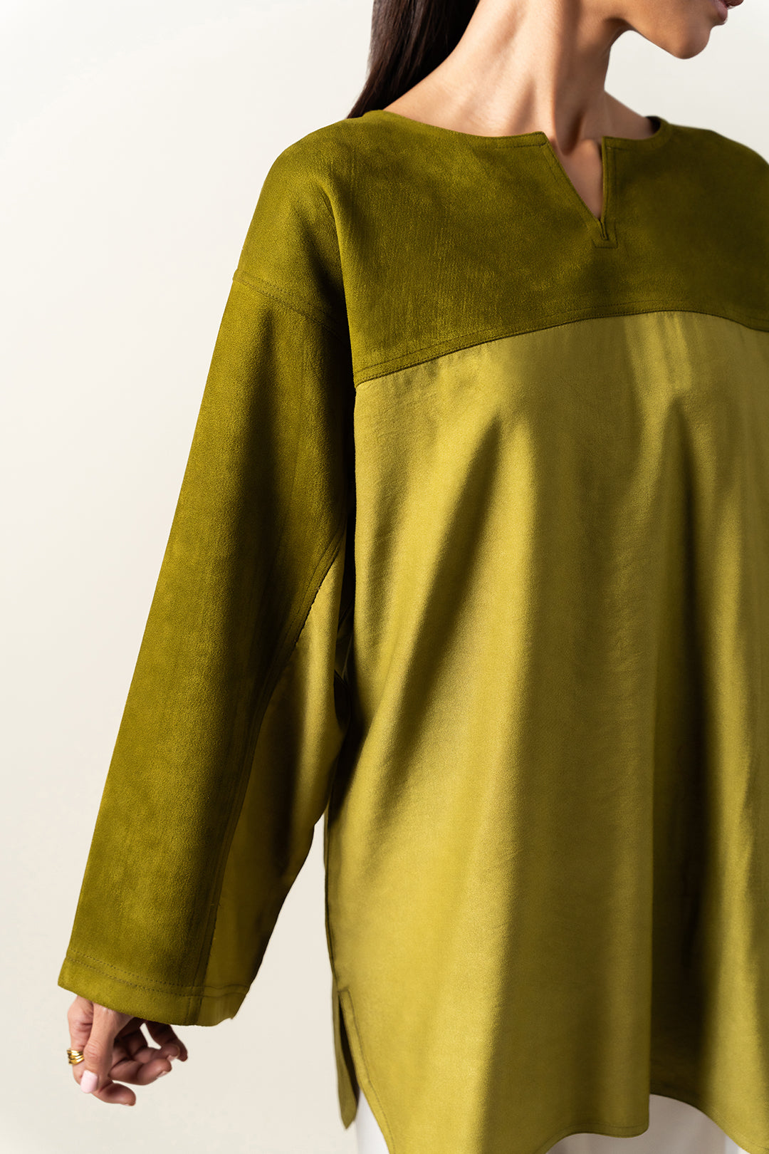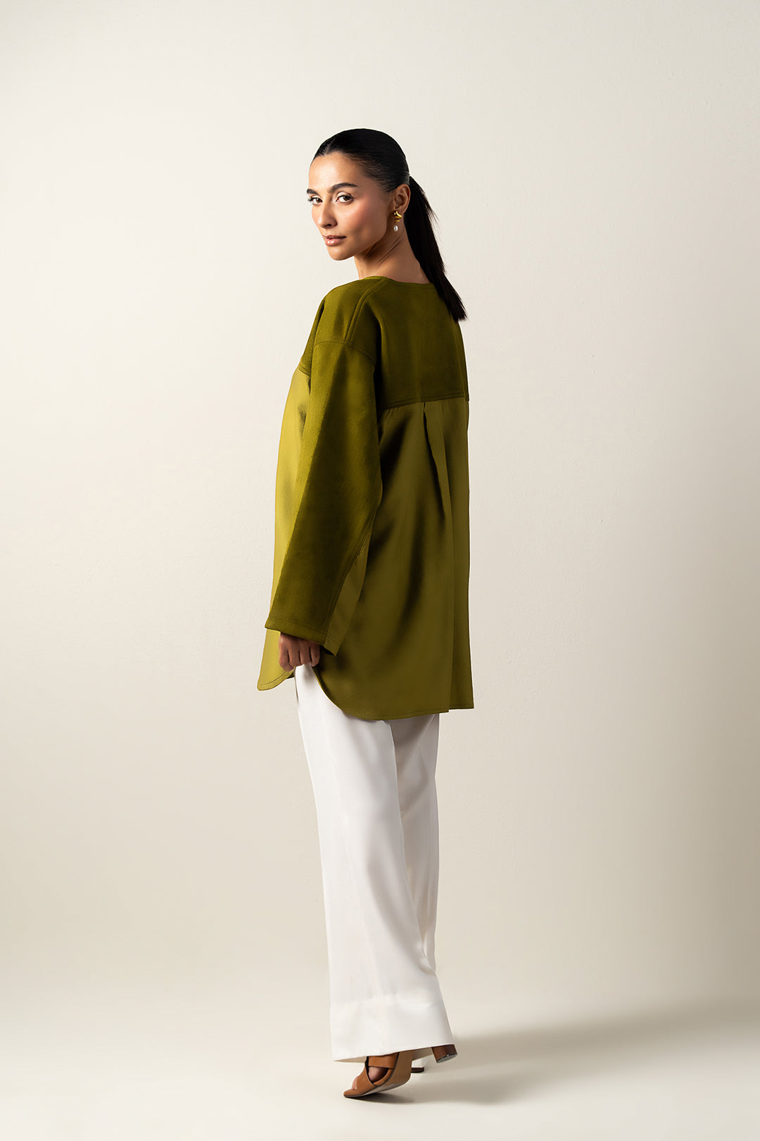 Crafted in soft viscose satin, this tunic features a crew neckline with a front V-cut and a suede yoke at both the front and back. Designed with drop shoulders and a box pleat at back below the yoke. the Suede panel has top-stitch detailing and a rounded hem add subtle structure and refinement to the silhouette.
