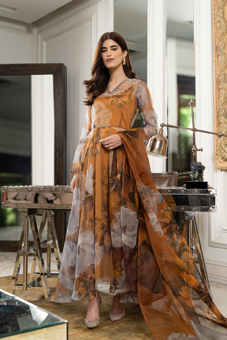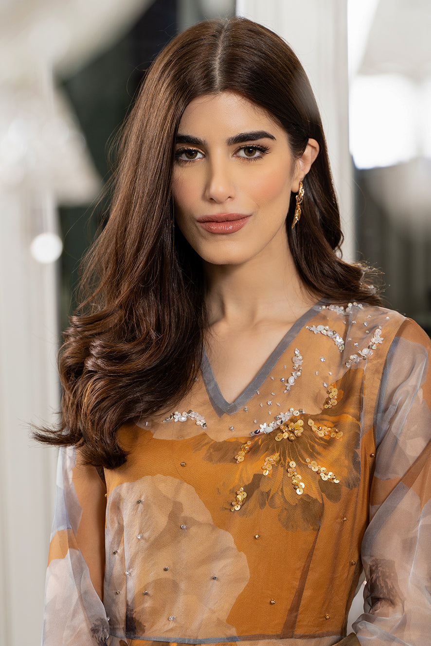 This hand-embellished mustard organza dress with beautiful floral print features a V-neckline, full length sleeves, side-zip closure and flared hemline. It comes with a solid mustard sleeveless under-shirt . Length 50". Model is wearing size S. Model height is 5'8".