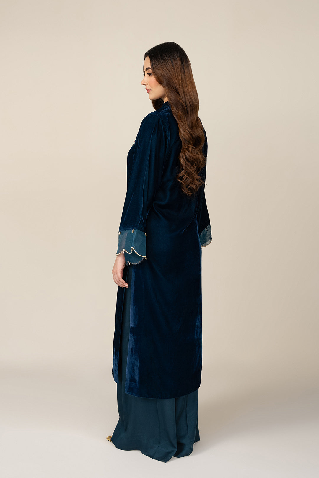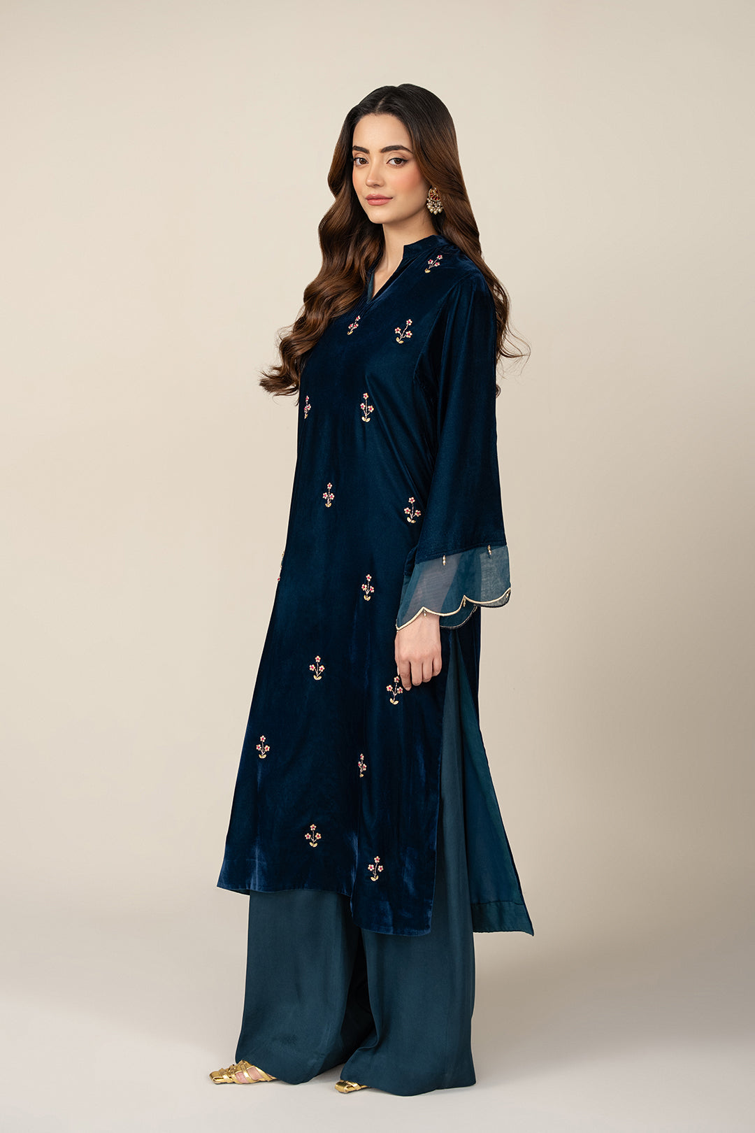 This top made in soft velvet fabric features ban collar with V-neck, full length flared sleeves with scalloped organza cuffs, side slits and straight hem. The front has a booti spray on it.