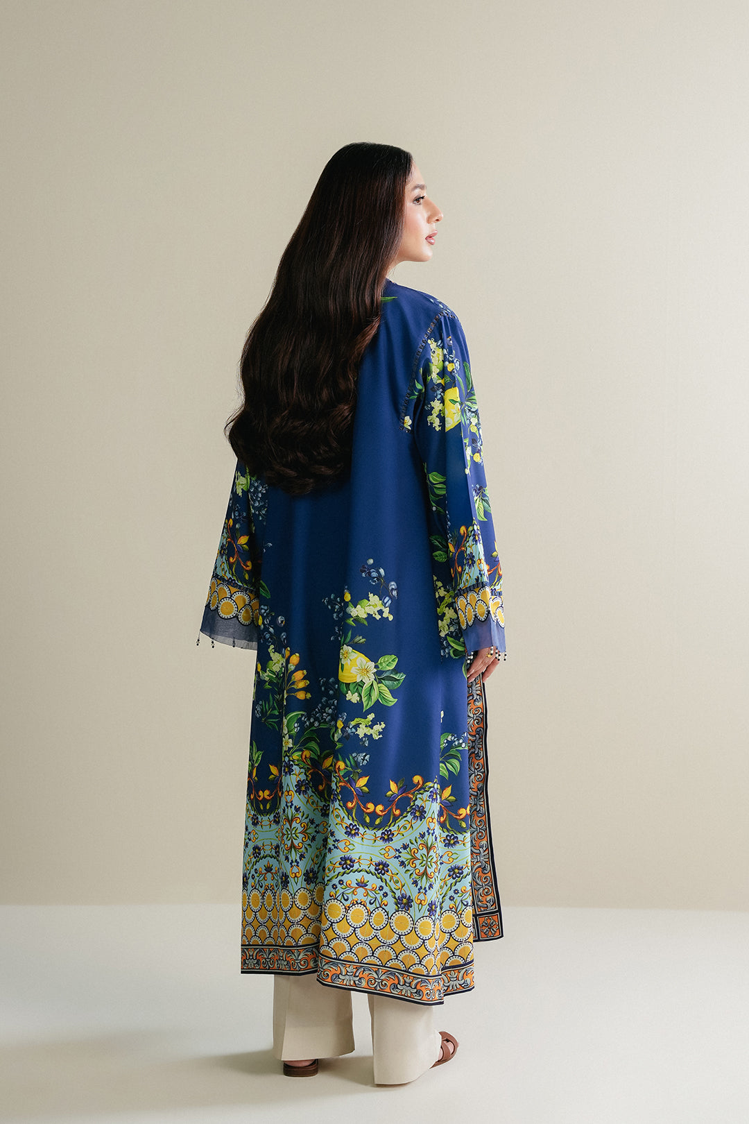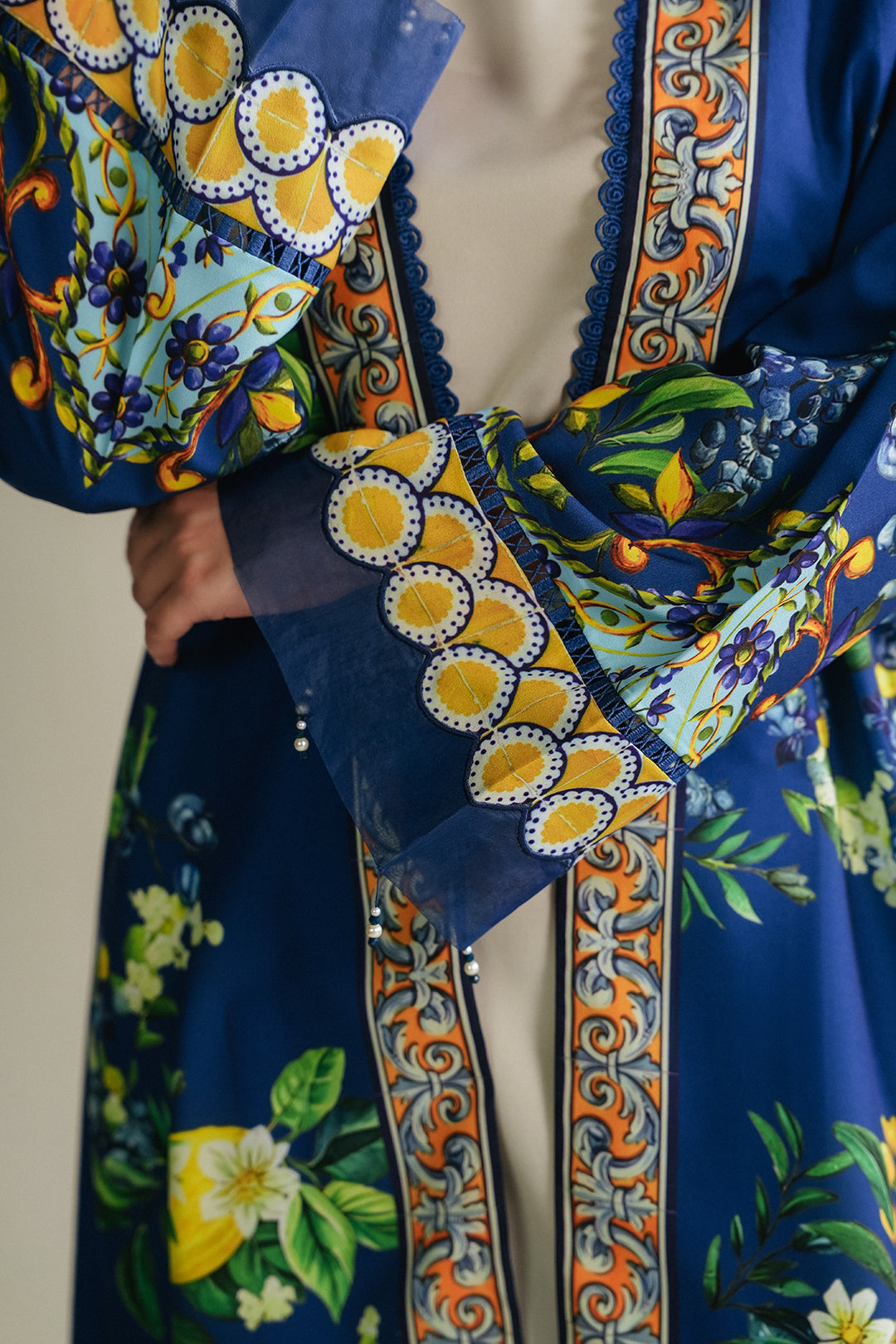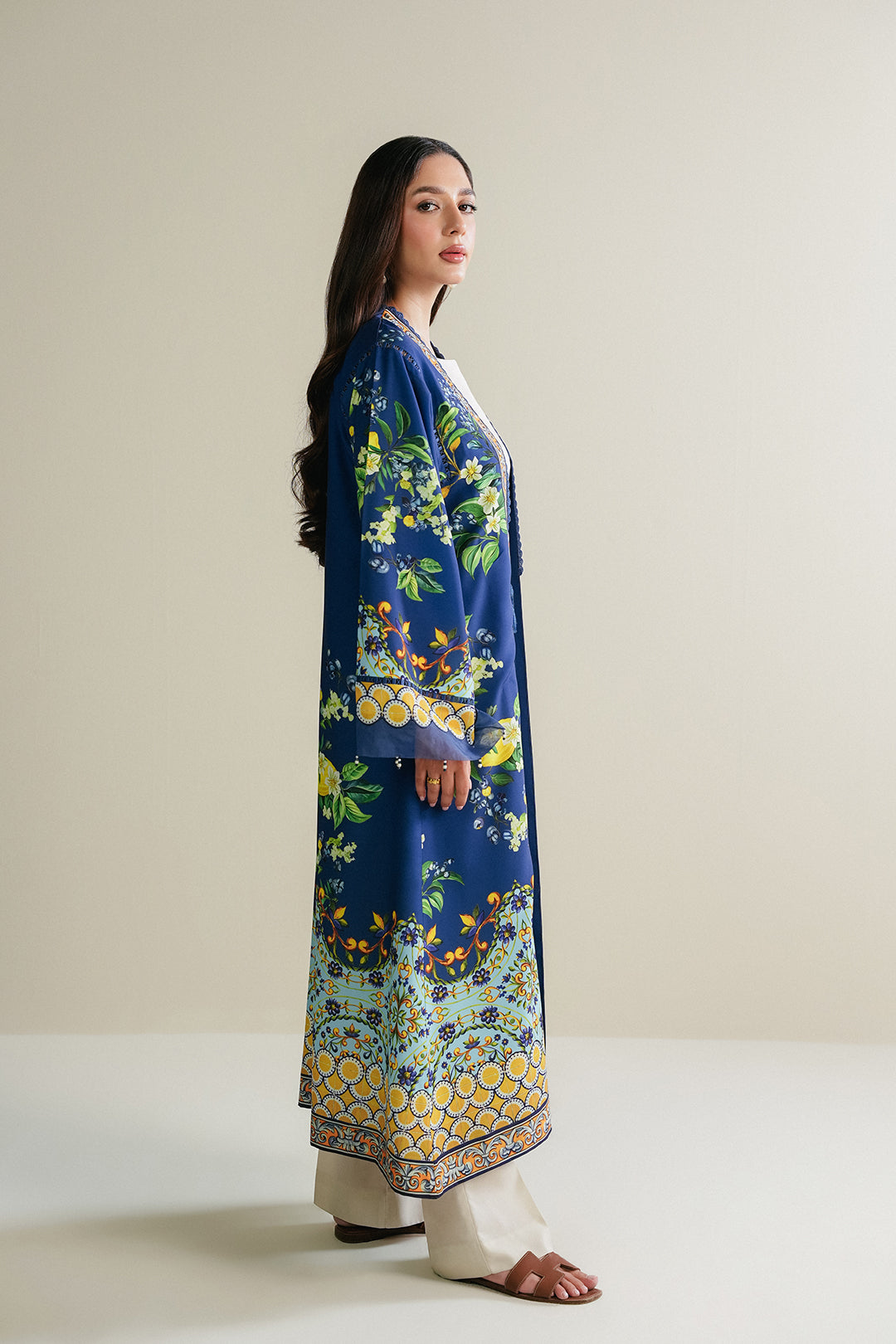 This shrug made in blue soft crepe fabric in floral print features front-open silhouette.