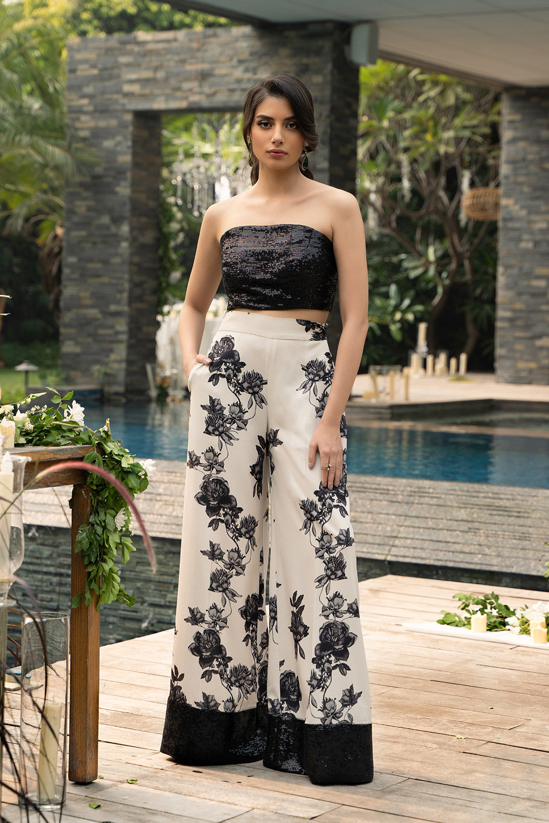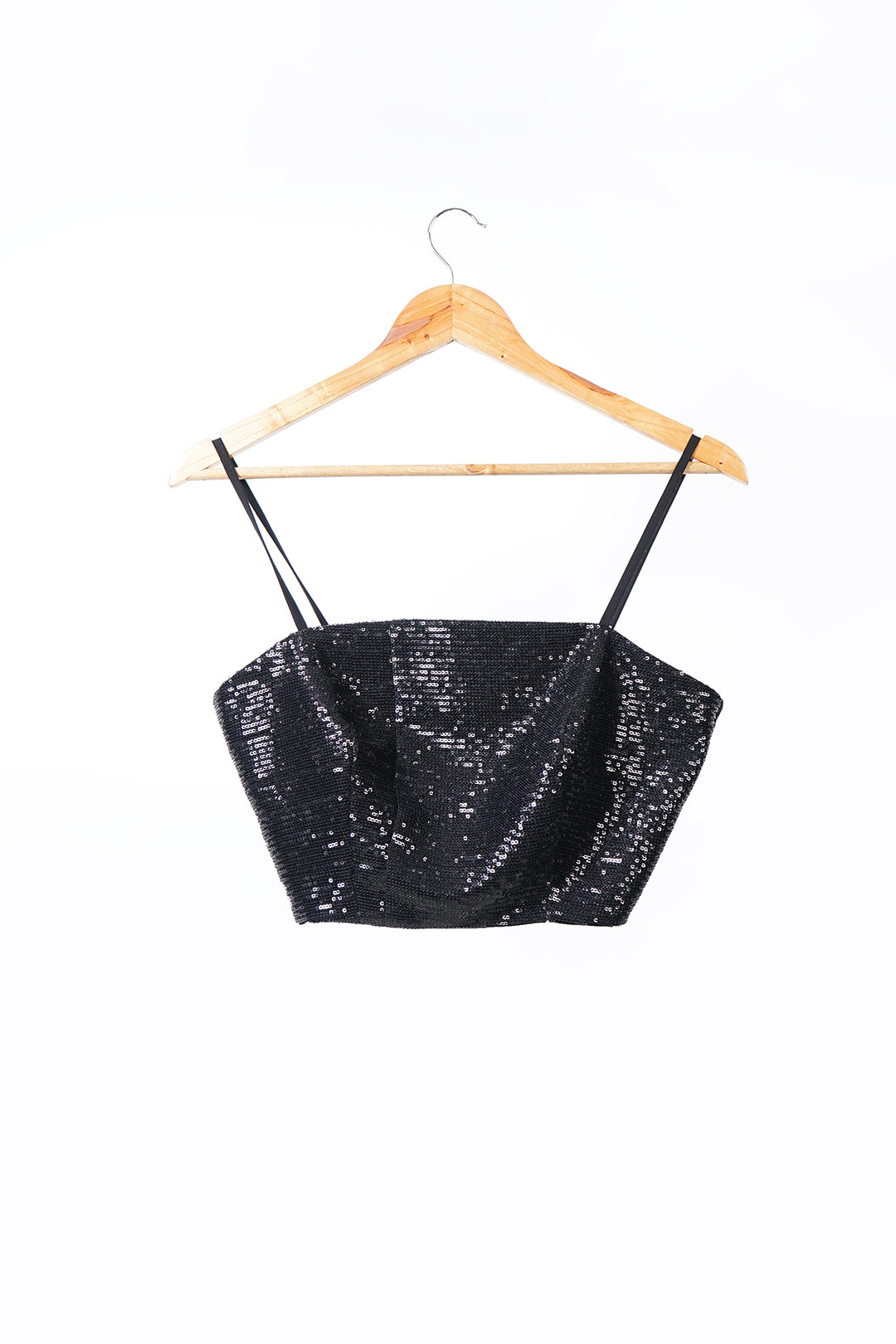 This bustier top made in soft crepe fabric with sequins embellishment on the front.