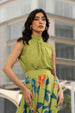 This sleeveless parrot green crop top made in soft crepe fabric features a band-collar neckline with hook & eye closure at the back, gathers at front & back and a straight hemline. Length 20''. Model is wearing size S. Model height is 5'9''.