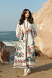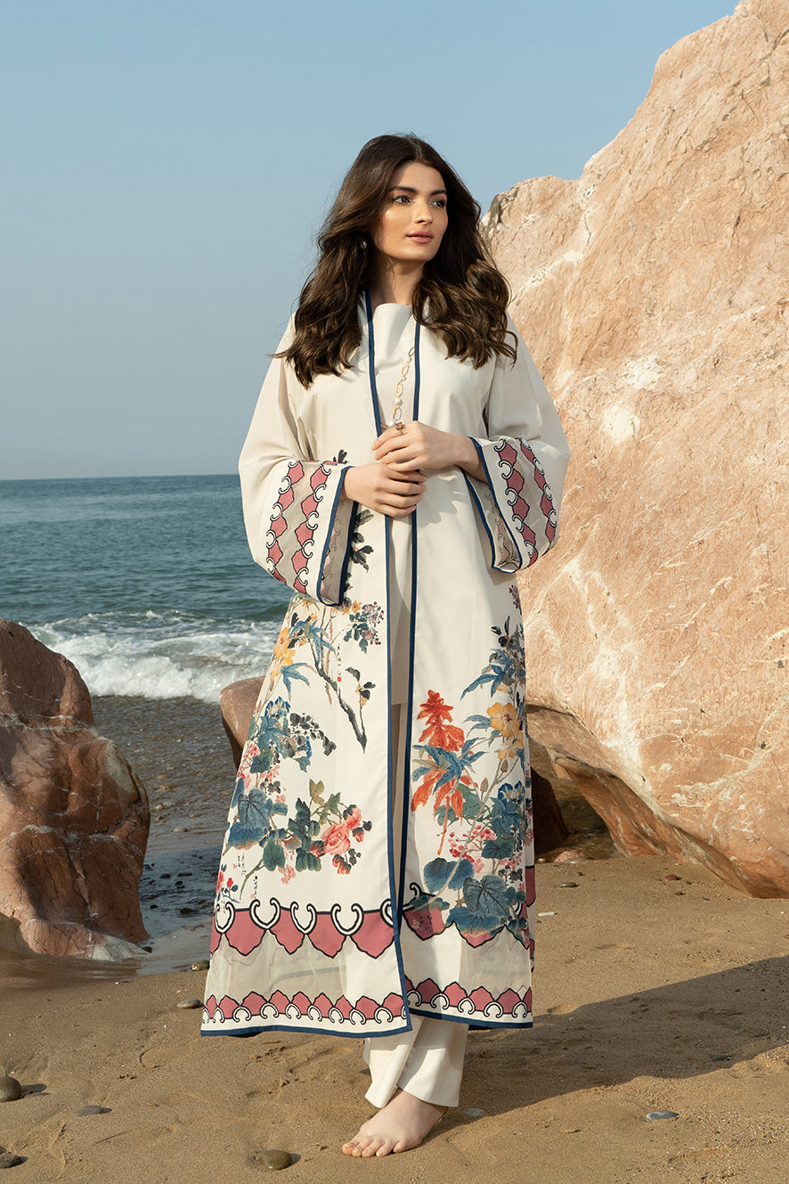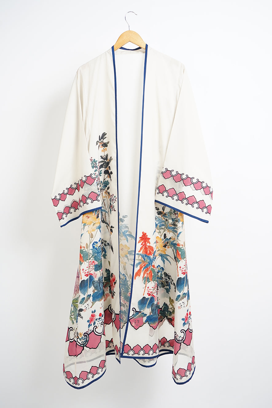 This multicolored long shrug with botanical print made in soft crepe fabric features a front-open silhouette with band-collar, straight armholes, loose-fit full-length sleeves and a flared hemline. It has patch-work detailing with organza inserts running along the hemline and sleeve openings.