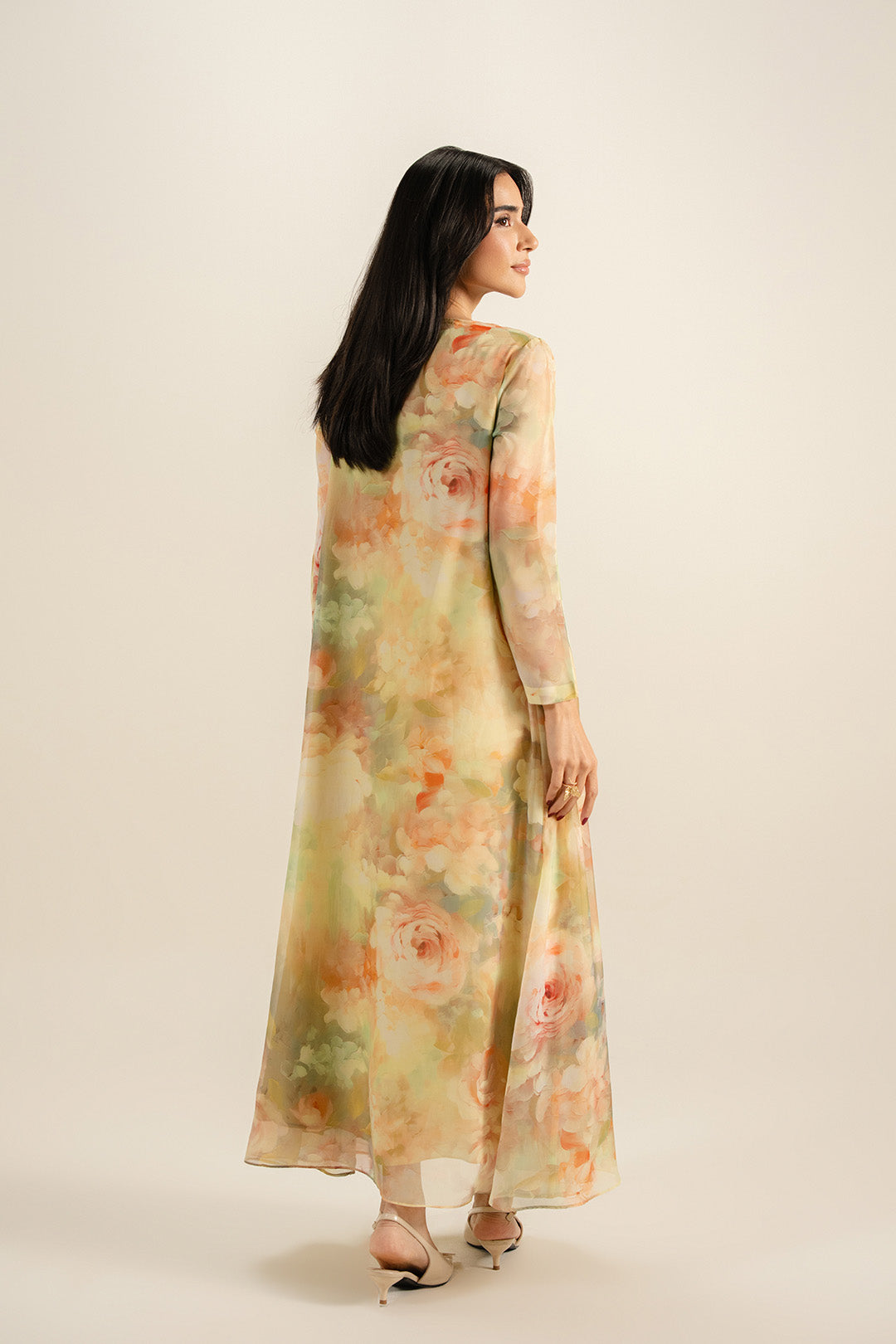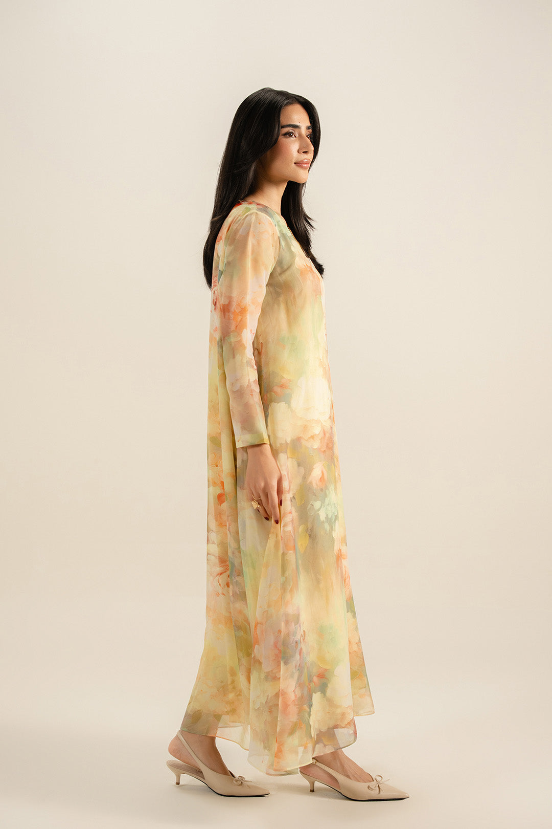 This sheersilk dress features a V-front neckline and basic full-length sleeves with facing. Designed with a flared bottom for graceful movement, it comes with an attached lining for added comfort.