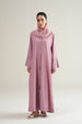 This abaya is made from blush pink crepe fabric and features a V-neck, front-open with a hidden placket. It has dyed buttons with button holes for closure. The abaya includes a square armhole and flared sleeves with embellishments at the sleeve openings.