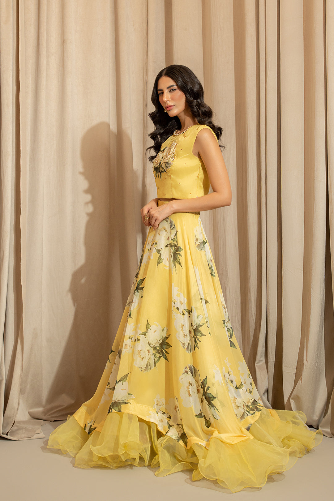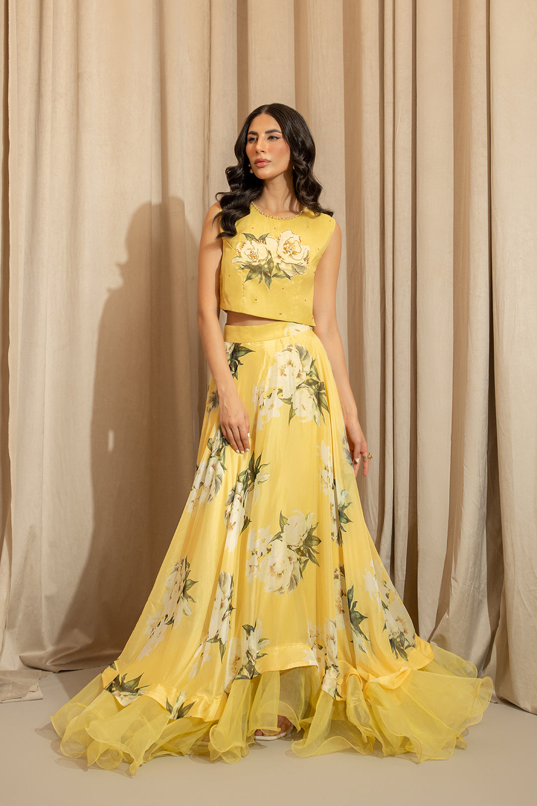 Sleeveless crop top made in printed soft silk fabric in floral print.