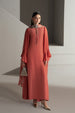 This flared Coral medium silk dress stirs up a fluttery summer affair, with ruffled sleeves it flows through the air, delicate and subtle.