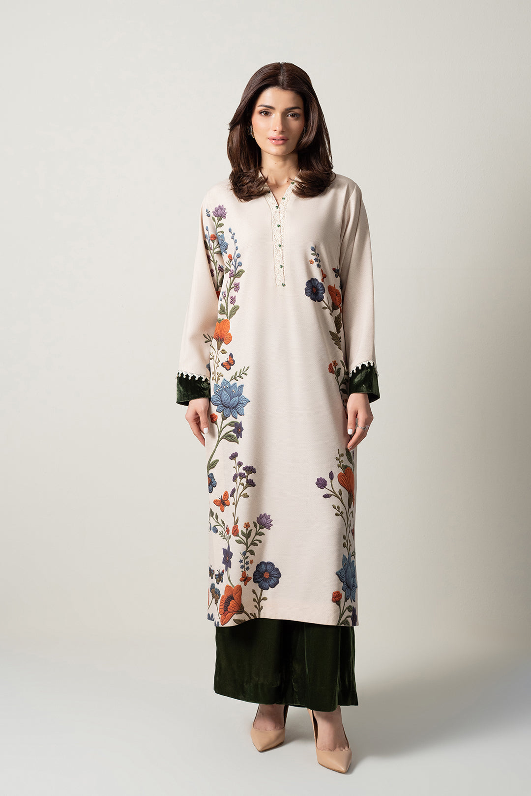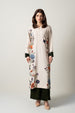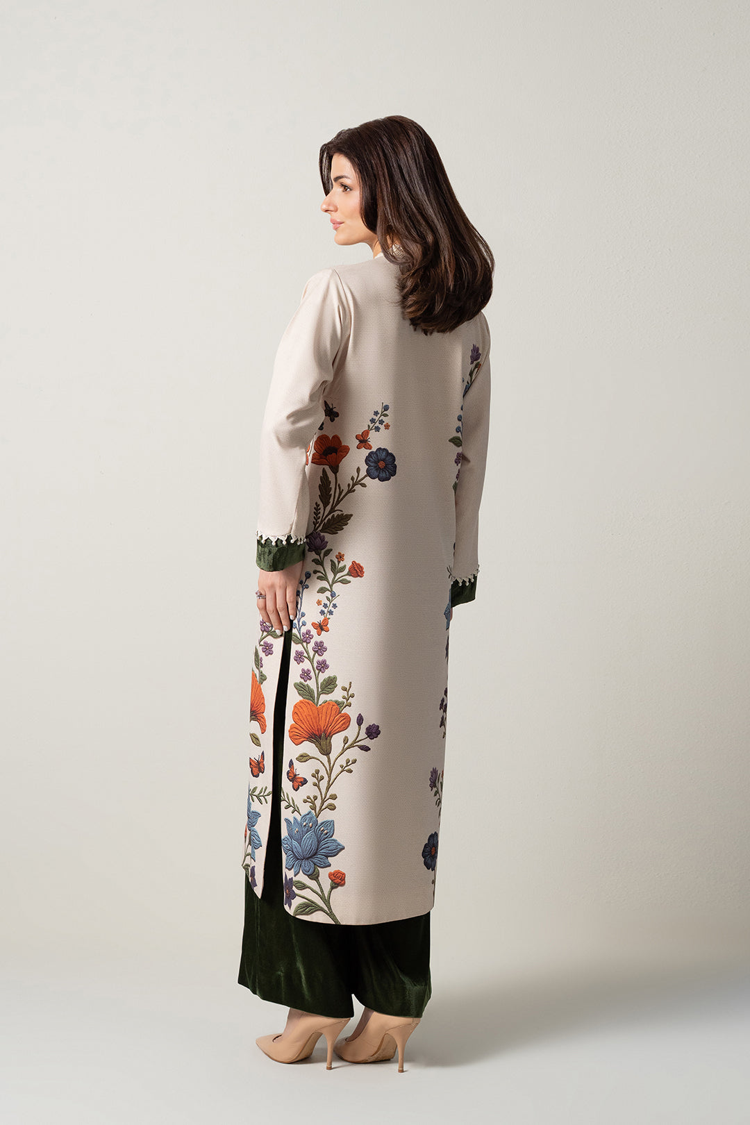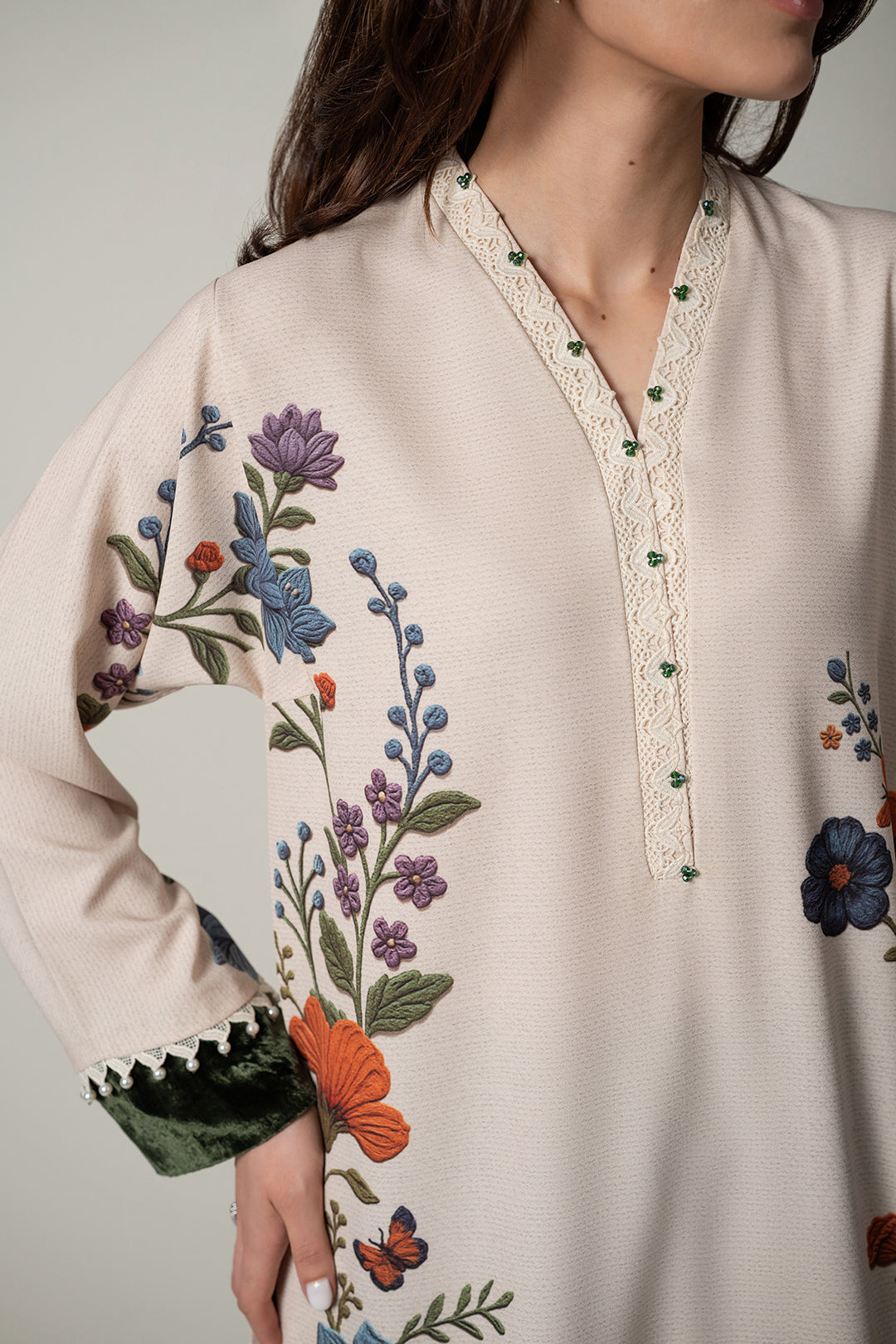 This top made in soft crepe fabric in floral print features Y-neck with lace insertion and square armholes. It has full length flared sleeves with velvet cuffs and lace insertion. The neckline and sleeves have crystal bunches. This top has side slits and straight hem.
