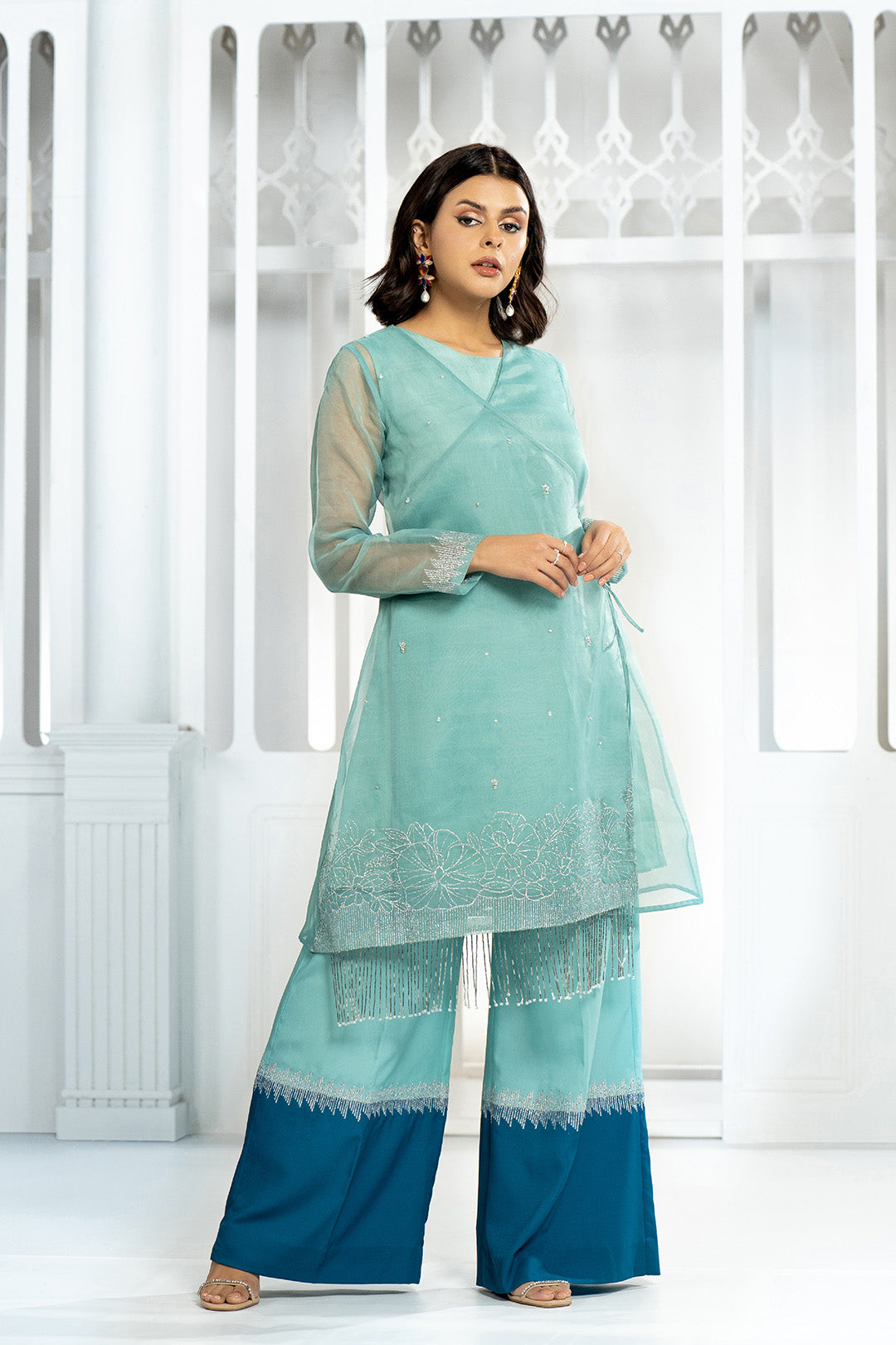 These wide leg pants made in soft crepe fabric features green & blue color block panel and embroidery detail on the hem. It has semi-elasticated waistband with hook & eye closure and pockets on the side. Pair it with "Dehrin Top" to complete the look. Length 40".