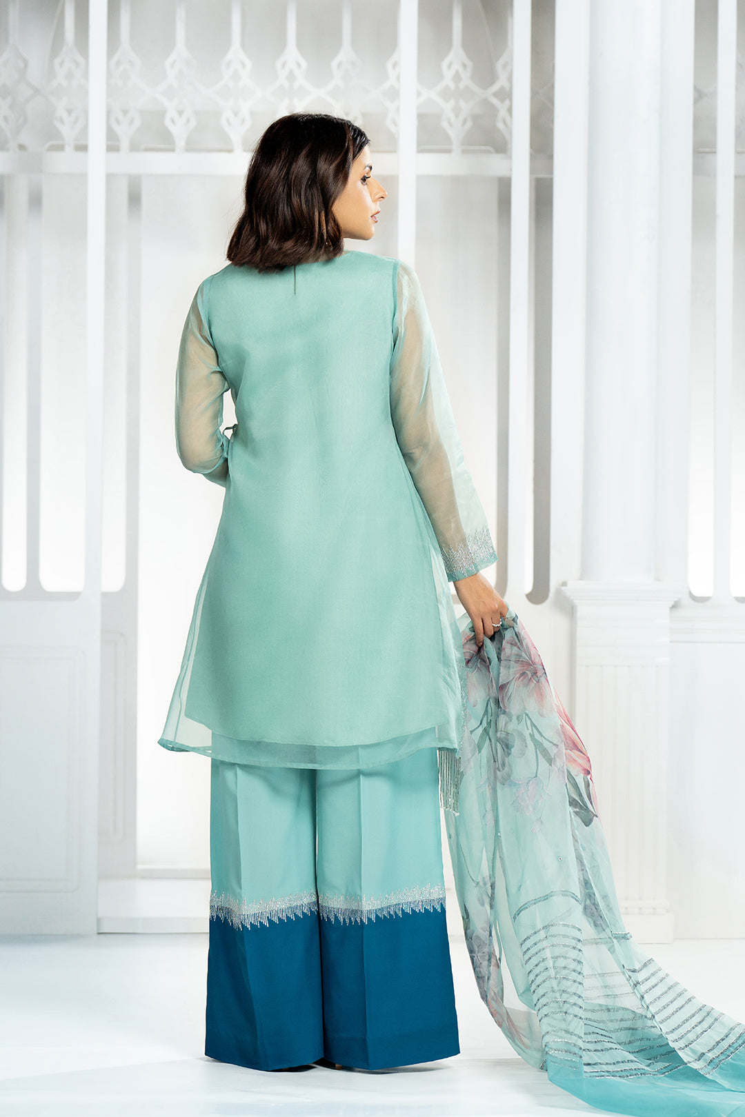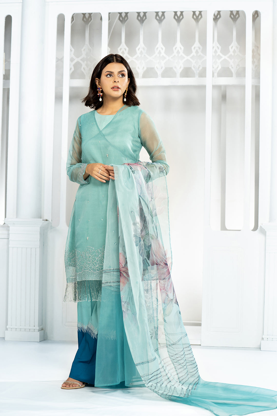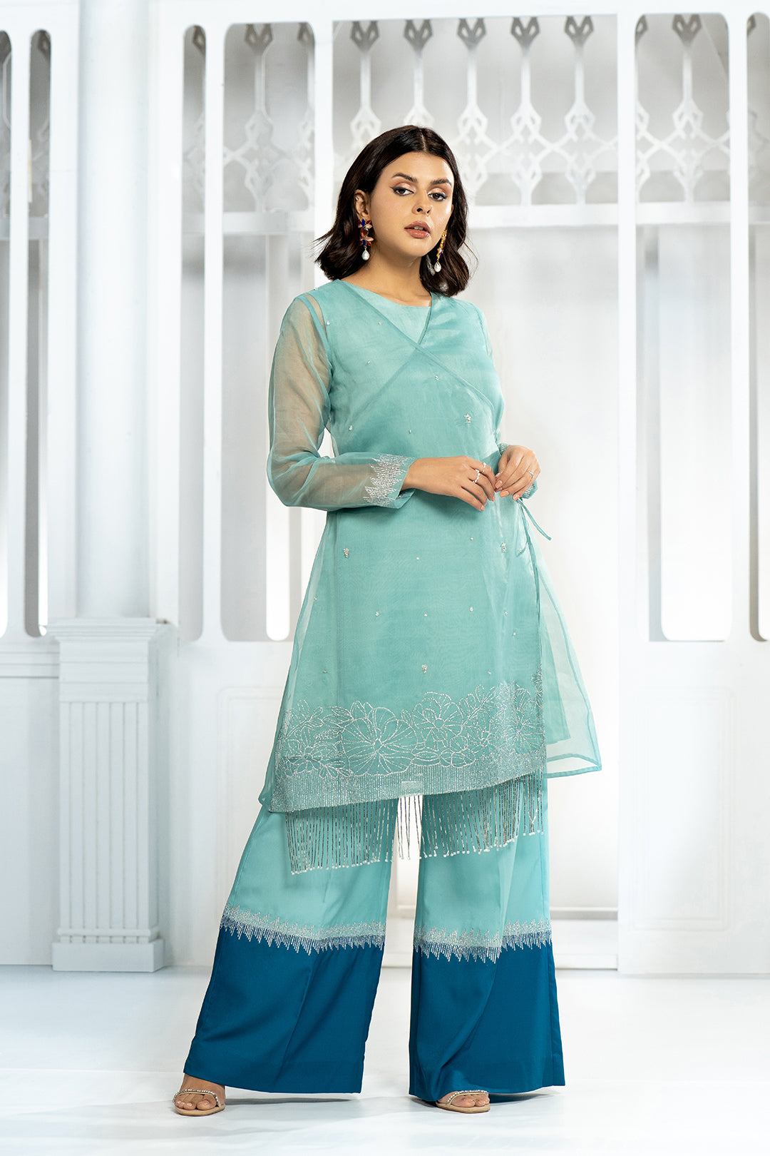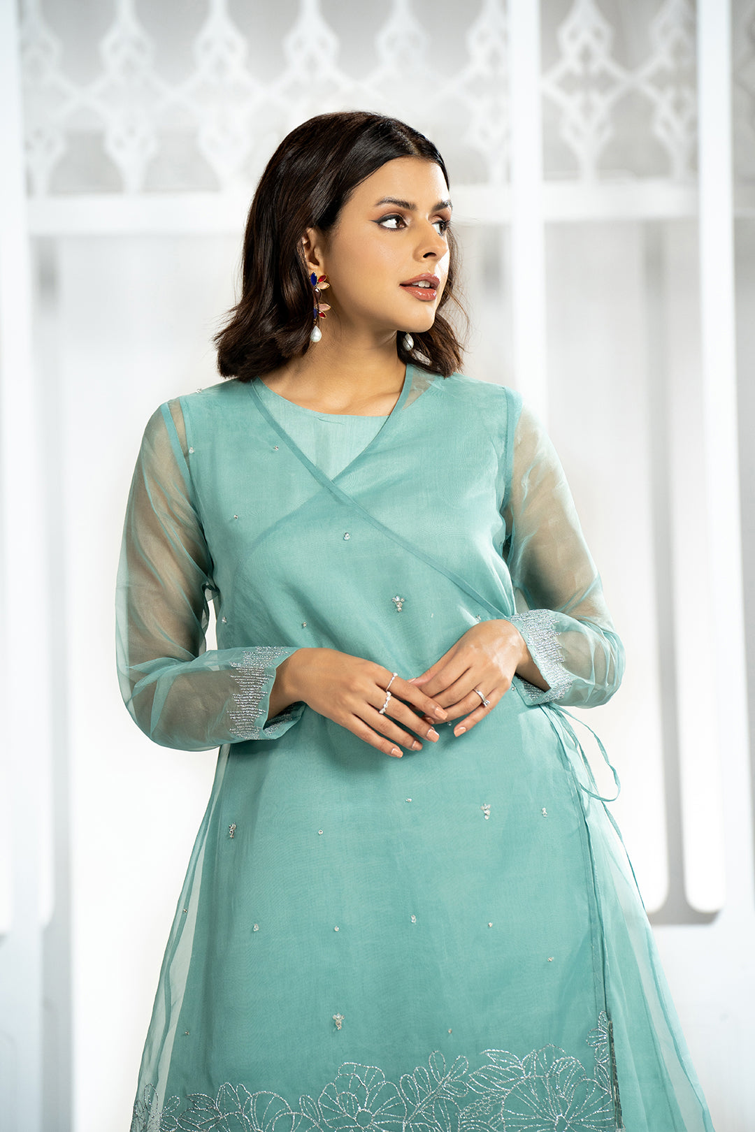 This turquoise top made in organza fabric features v-neck, overlapped front with tie-up closure, full-length sleeves, embellished front, silver embroidery on front and sleeve opening & crystal hangings along the hemline. Length 36". Pair it with "Dehrin Dupatta" & "Dehrin Pants" to complete the look. Model is wearing small size. Model height is 5'3.