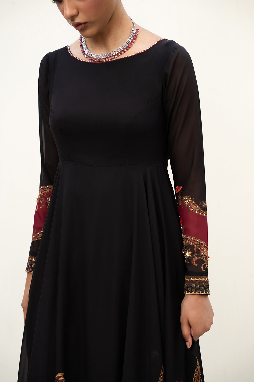 This pishwas made in black soft georgette chiffon fabric in print features round embellished neckline.