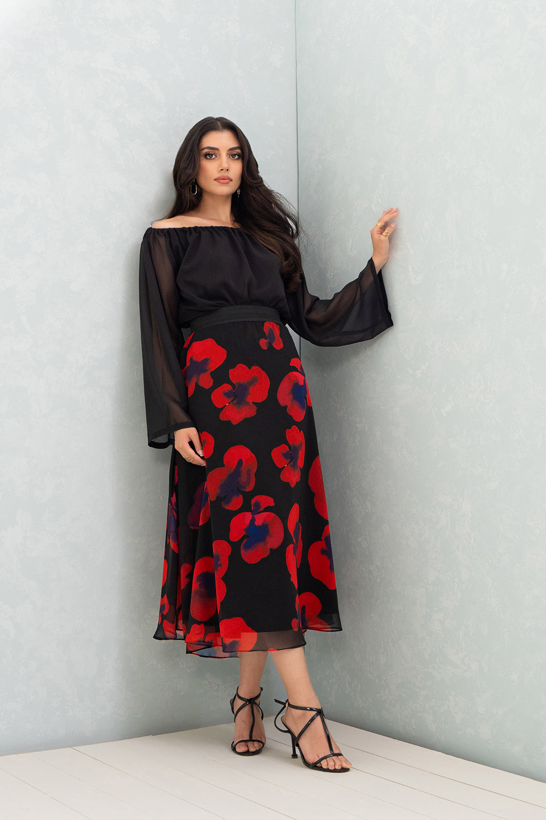 This black skirt made in georgette chiffon fabric in floral print features elasticated waist band and side zipper closure. It is lined with black viscose fabric. Model is wearing size S. Length 36". Model height 5'4".