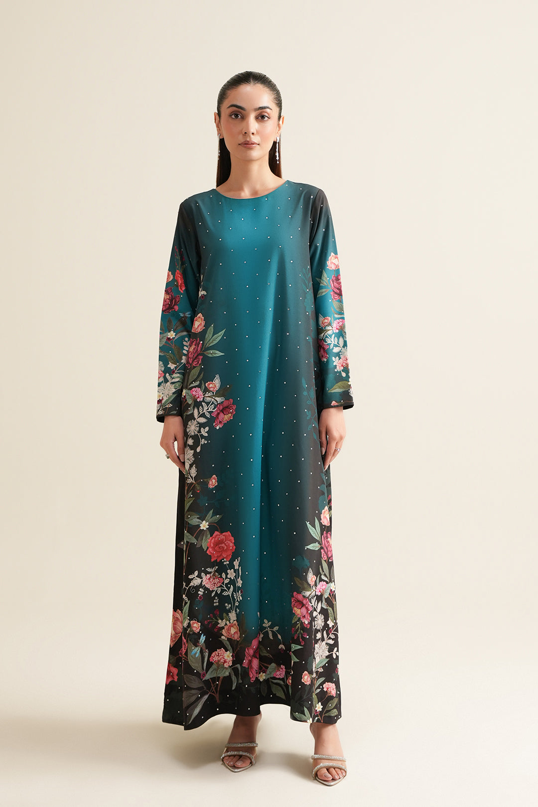 This gradient floral printed crepe dress features a crew neckline with a back neck slit and full-length sleeves. Designed with an A-line hem, it is accented with subtle embellishments on the front and sleeves for an elegant finish.