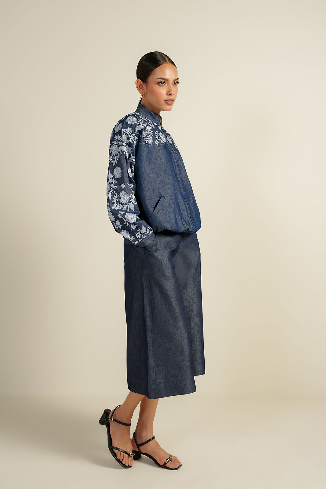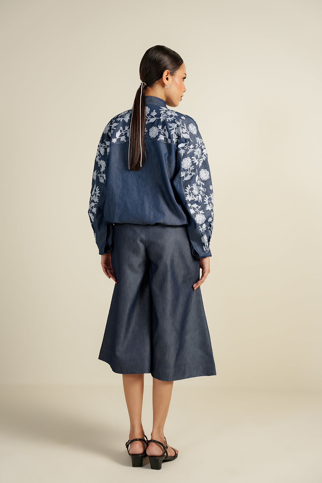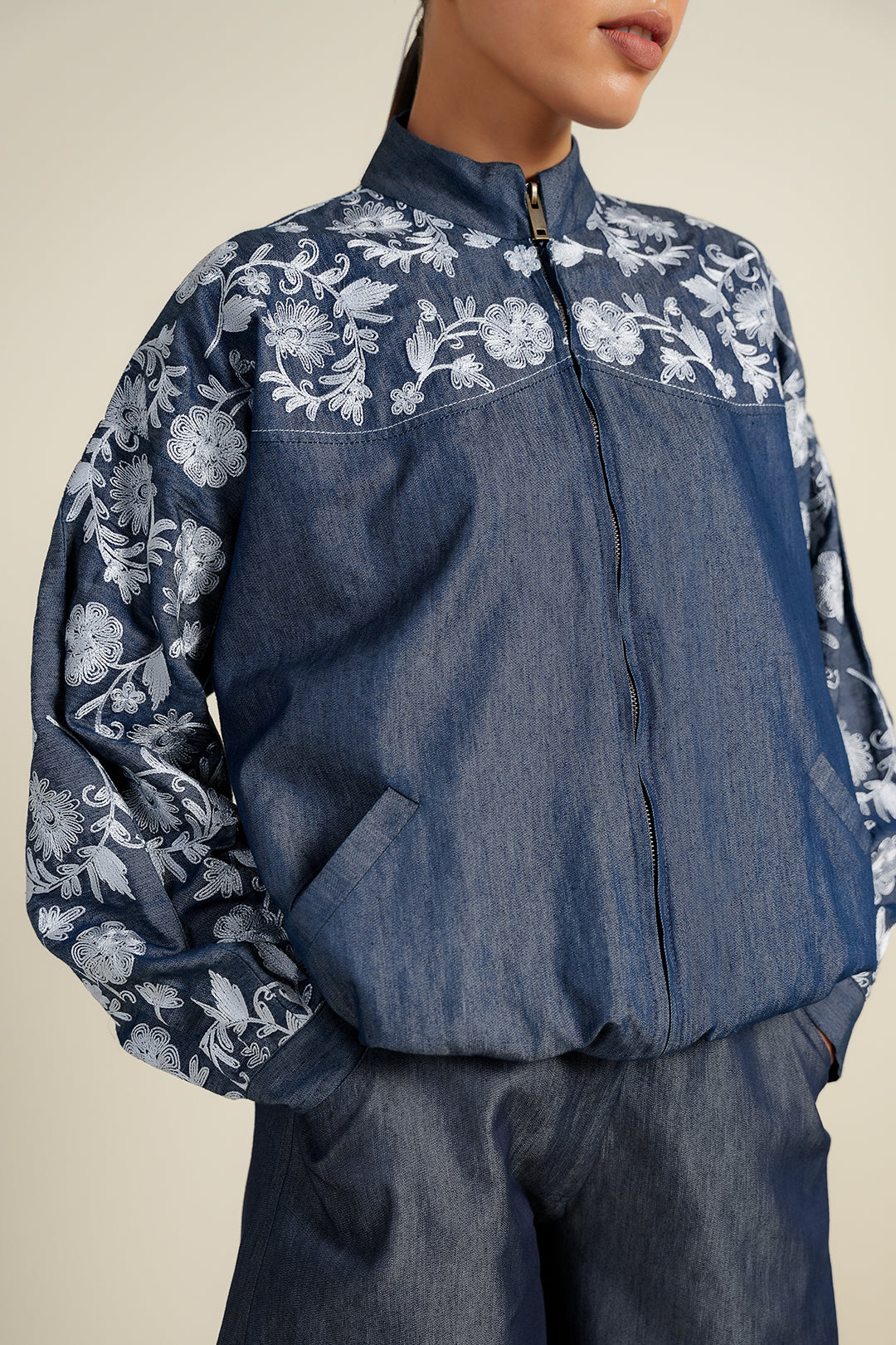 Crafted in Tencel denim, this front-open bomber features multihead embroidery on the front yoke and sleeves.