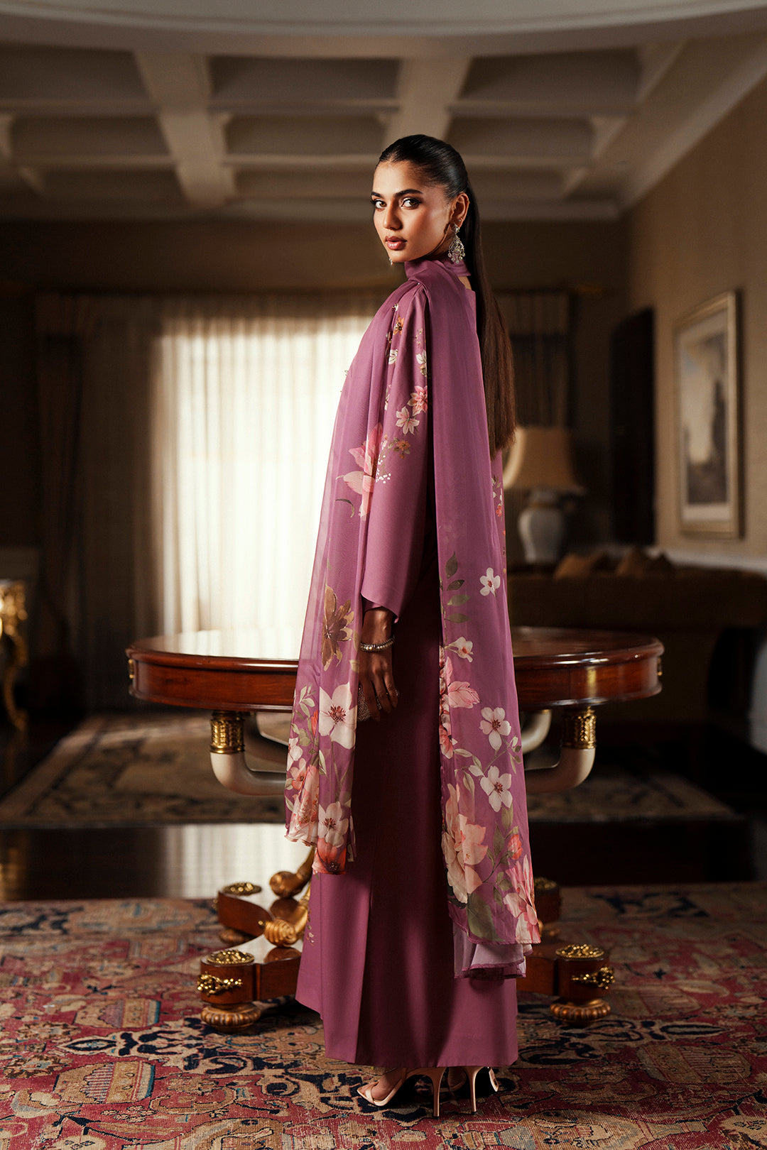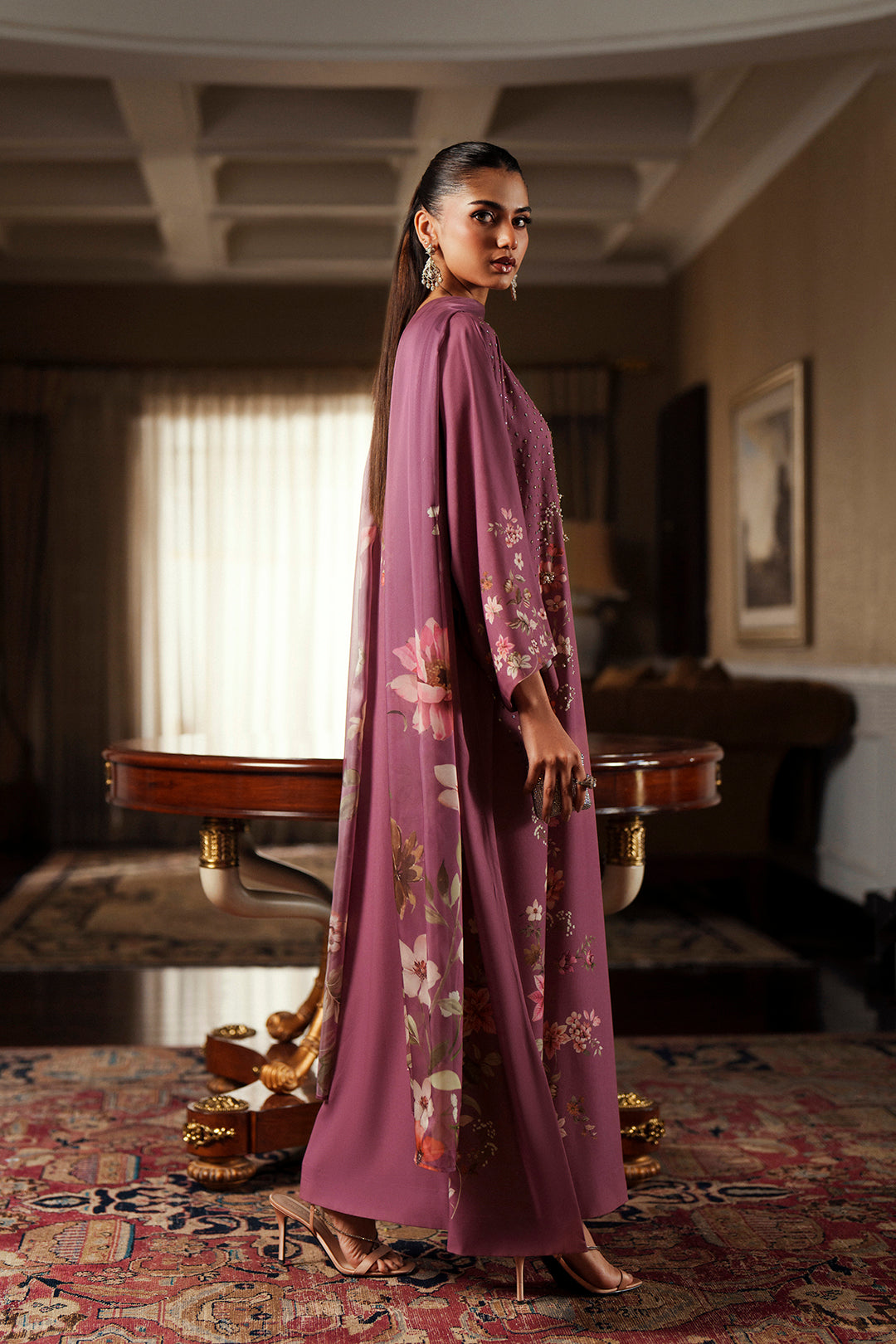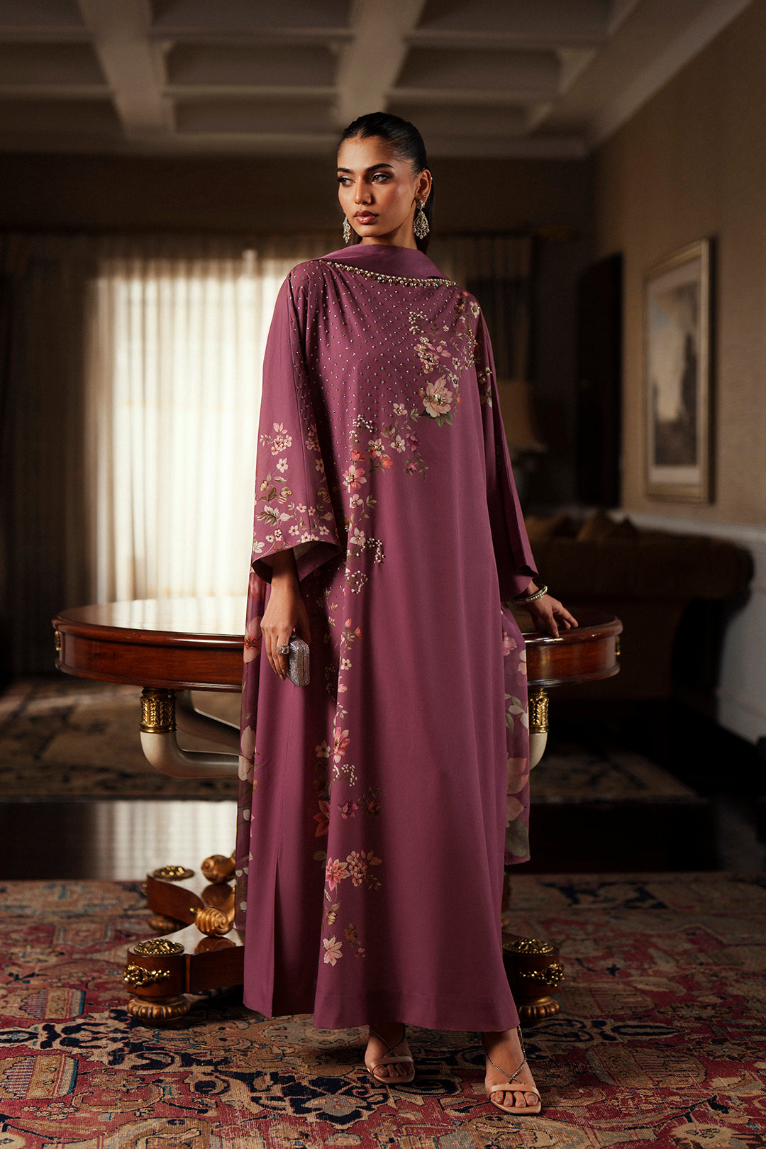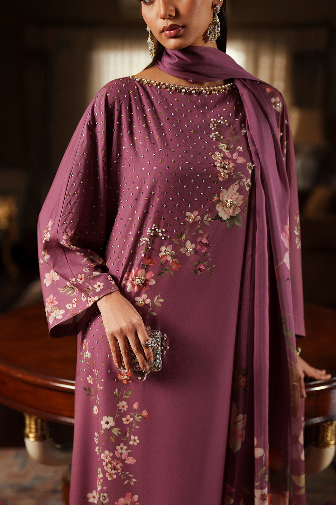 • Stun in this pretty tea pink printed and embellished floral crepe dress. Crystallized boat neckline with diffused spray down the side of the floral print. Batwing sleeves for a modern edge. Pair with "Ghizaar Dupatta" to complete the look