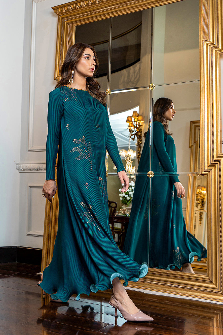 This pleated dress made in soft crepe fabric in a floral gold block print features a boat neckline with crystal embellishment detail, basic full sleeves and wired peco hem.