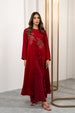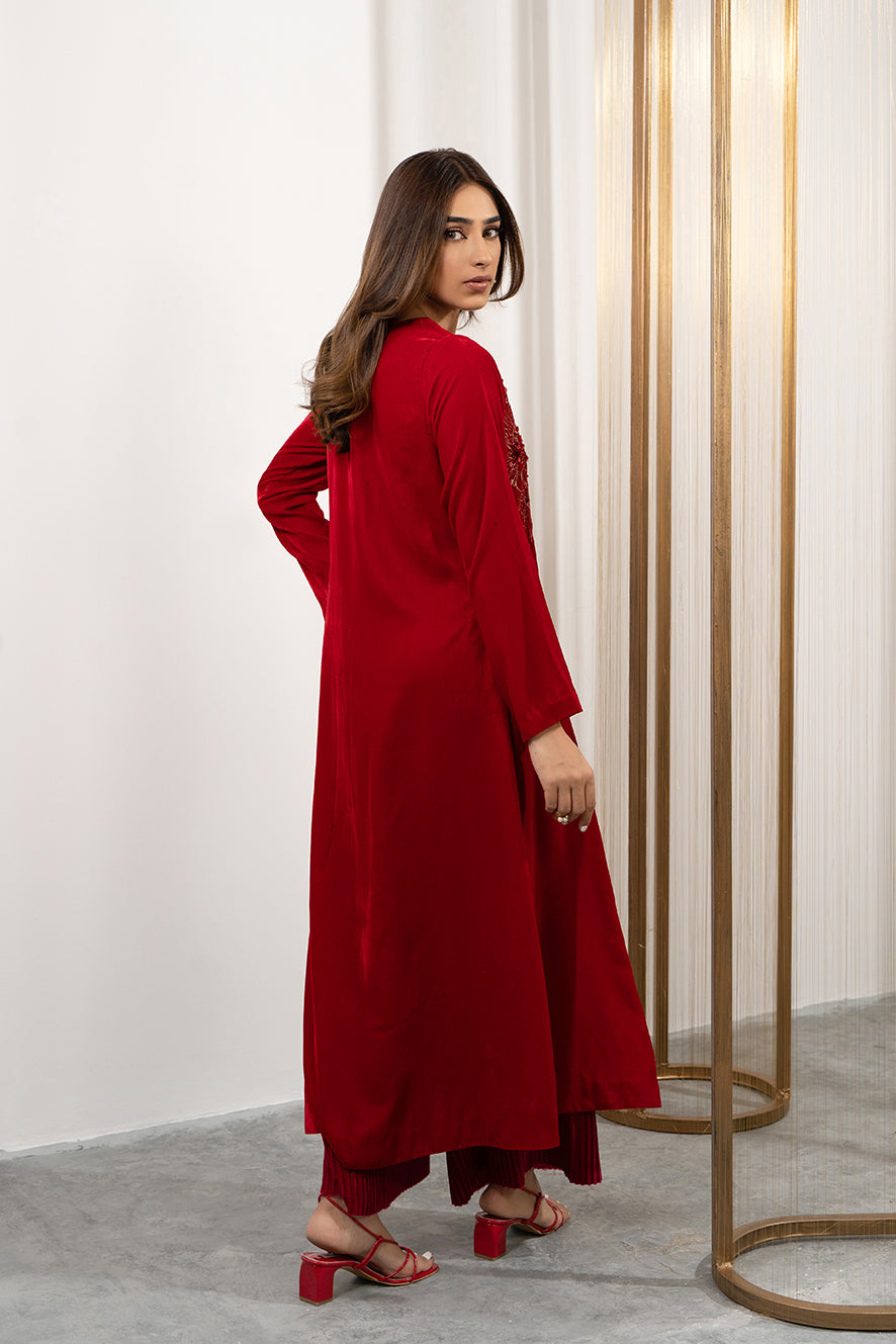 This red velvet embellished top features a crew-neck with slit opening with hook and eye closure at the back, full-length sleeves,side-slits and scalloped center front slit. Length 50". Model is wearing size S. Model height is 5'5".