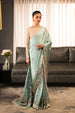 This saree is made in floral printed mint green charmeuse silk fabric. It is paired with an ivory blouse made in soft crepe fabric that features scoop neck with embellishment along the neckline and full-length fitted sleeves. This saree has an adjustable hook and eye closure and comes with a petticoat made in ivory viscose fabric.