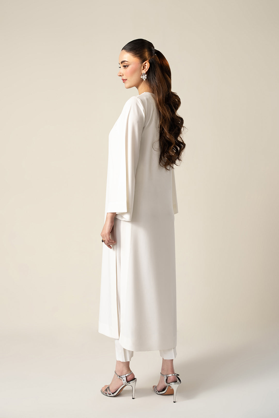 This top made in soft crepe fabric in floral print features crew neck with back neck slit and hook and eye closure, embellished front, full length flared sleeves. side slits and straight hem.