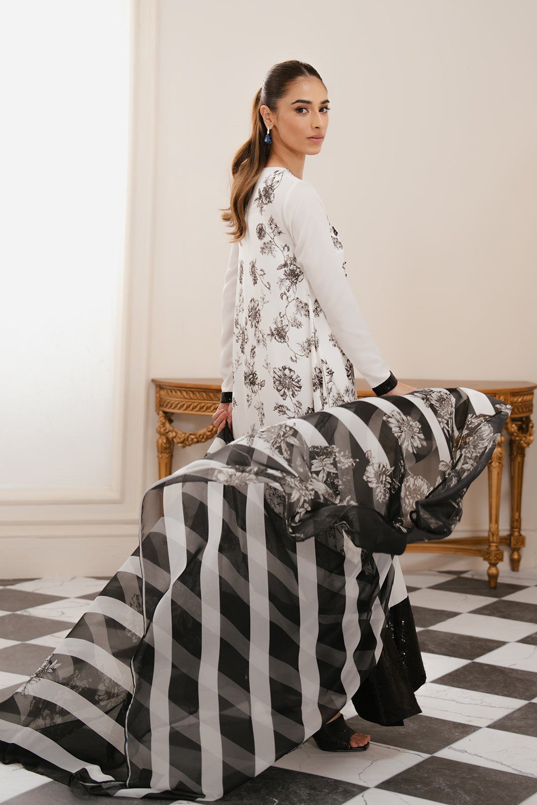 Black & white dupatta made in soft silk fabric in floral print.