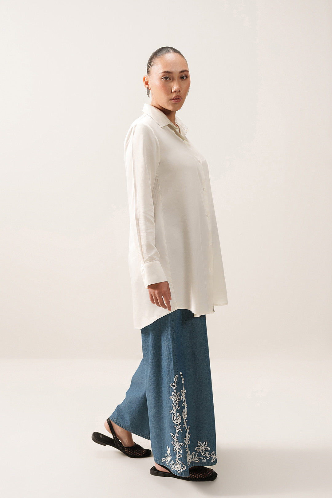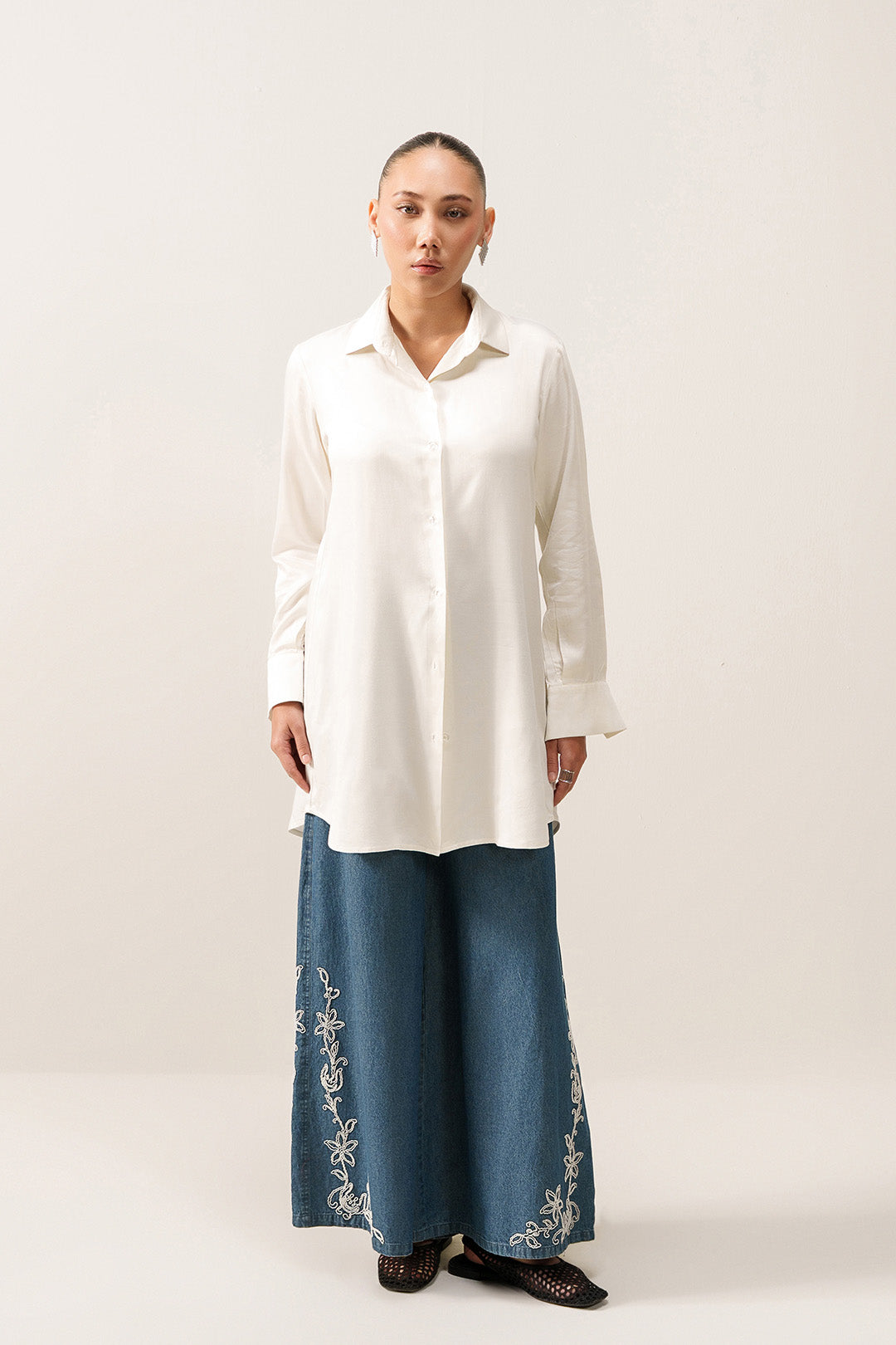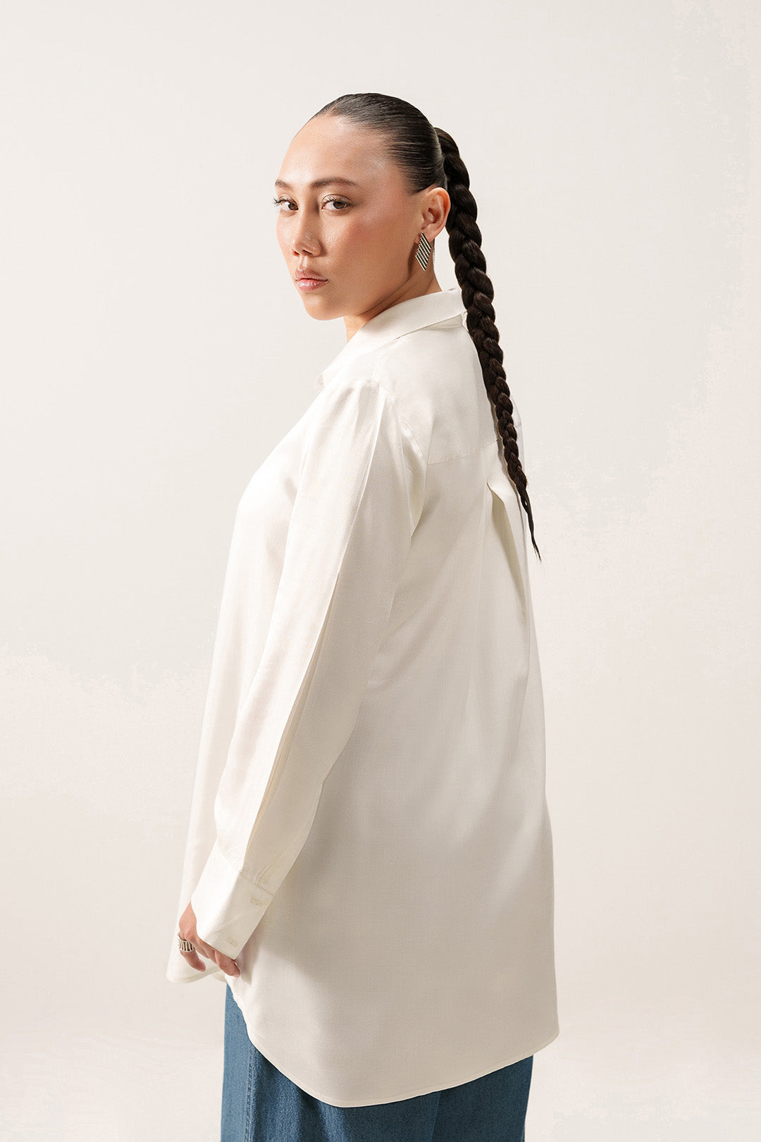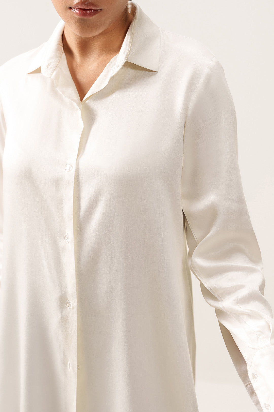 This button-down shirt made in soft crepe, features a two-piece collar, back yoke with an inverse box pleat, and full-length sleeves with cuffs. Designed with a front placket and a rounded hem.