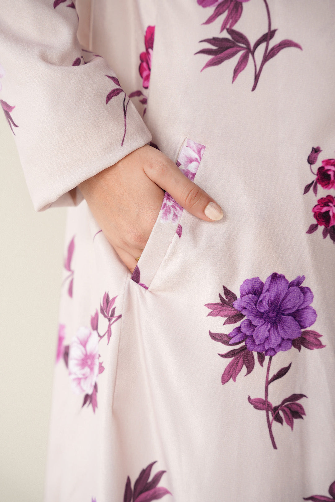 Crafted in soft velvet with a floral pattern, this trench coat features a classic notch collar, straight full-length sleeves, and a back vent detail.