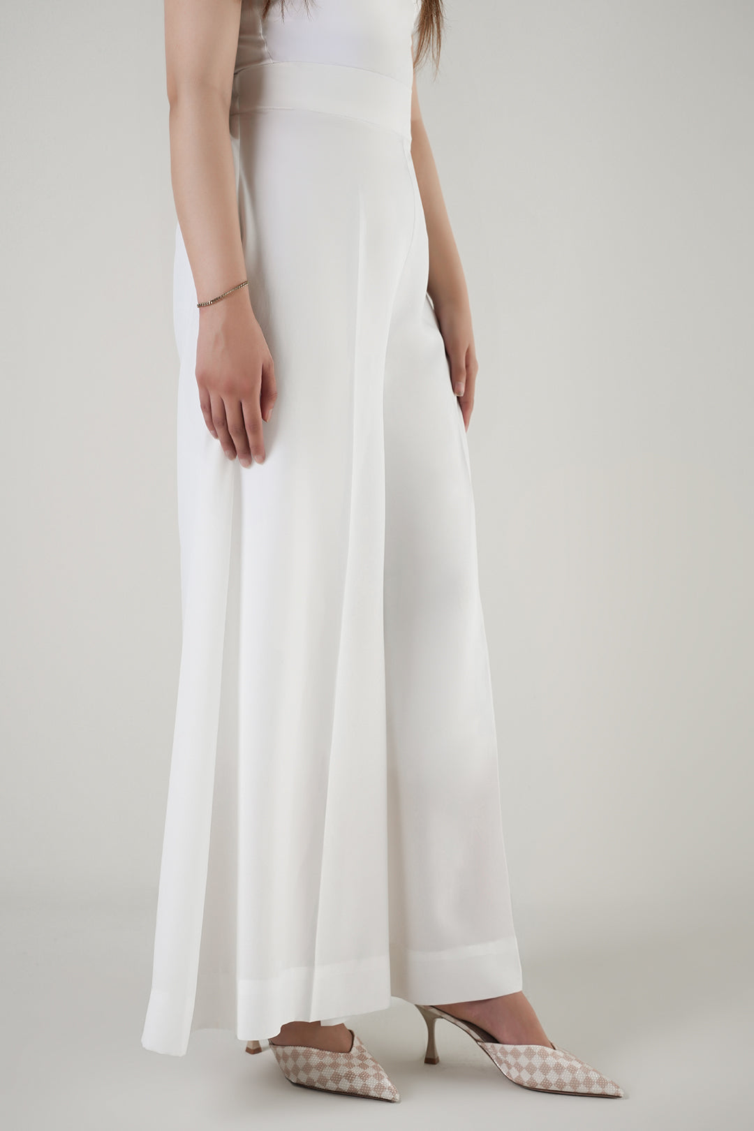 These flared solid pants are crafted from soft crepe fabric.