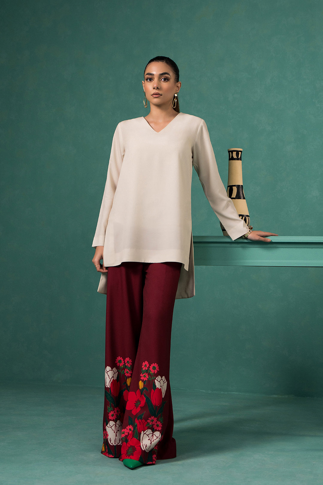 • These maroon wide-leg pants made in soft crepe fabric in floral print feature semi-elasticated waist band, side pockets, side hook & eye closure and zipper opening.