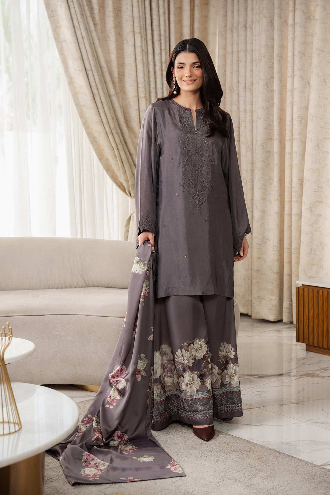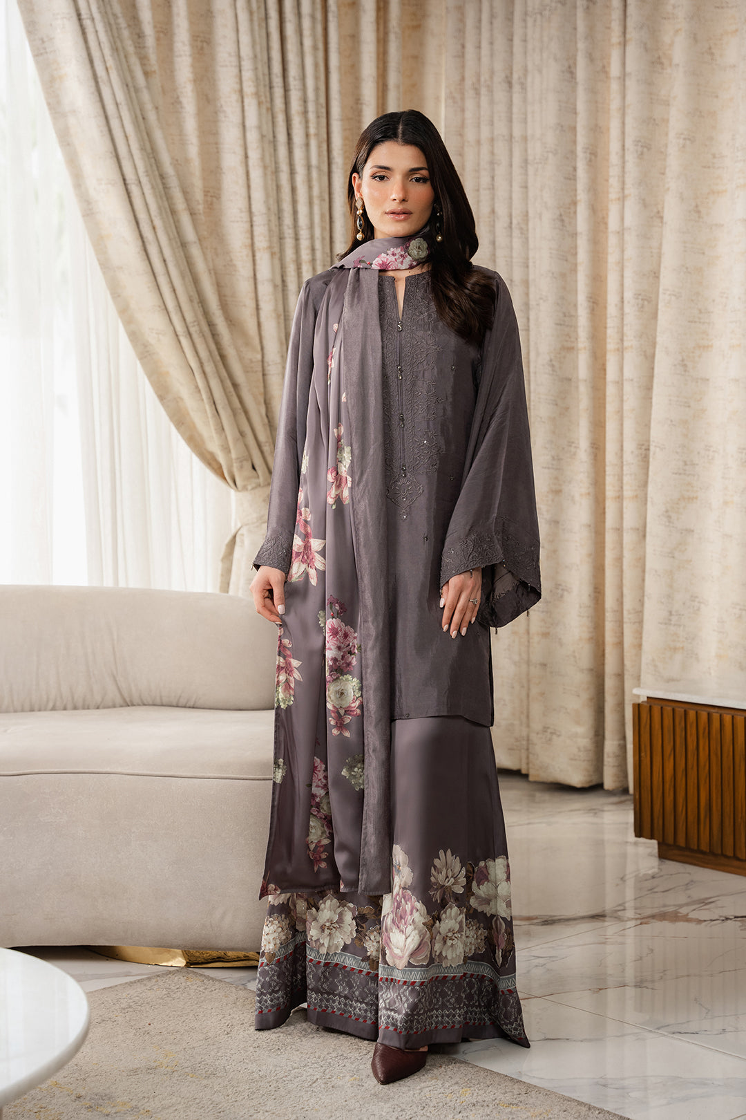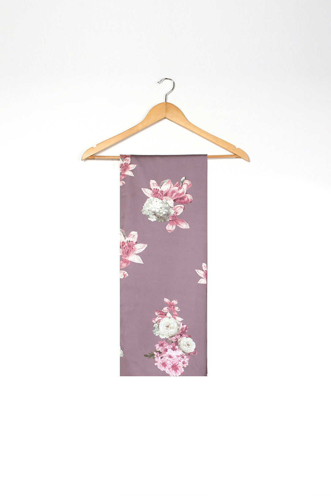 Grey stole made in soft velvet fabric is lined with grey silk fabric in floral print.