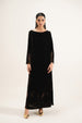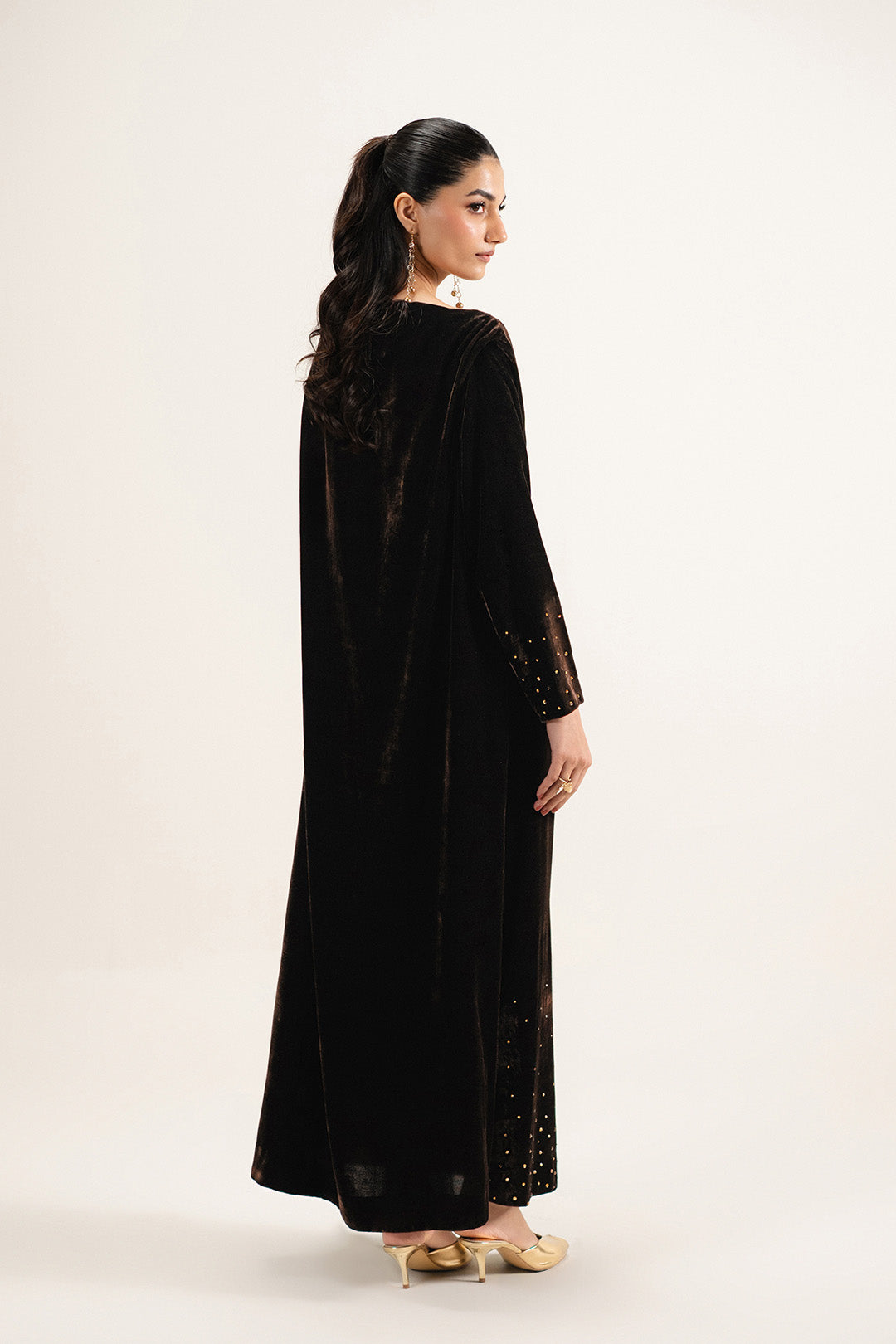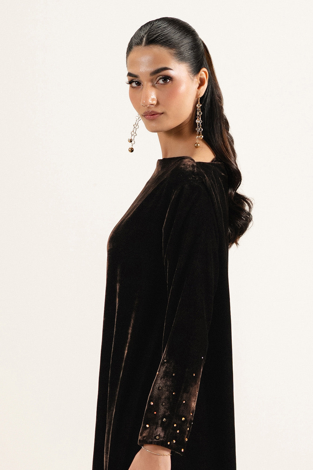 Crafted in soft velvet, this piece features a cowl neckline and straight full-length sleeves finished with facing. Designed with low side slits and finished with embellishment on the sleeves and bottom, with facing at the slits and hem.