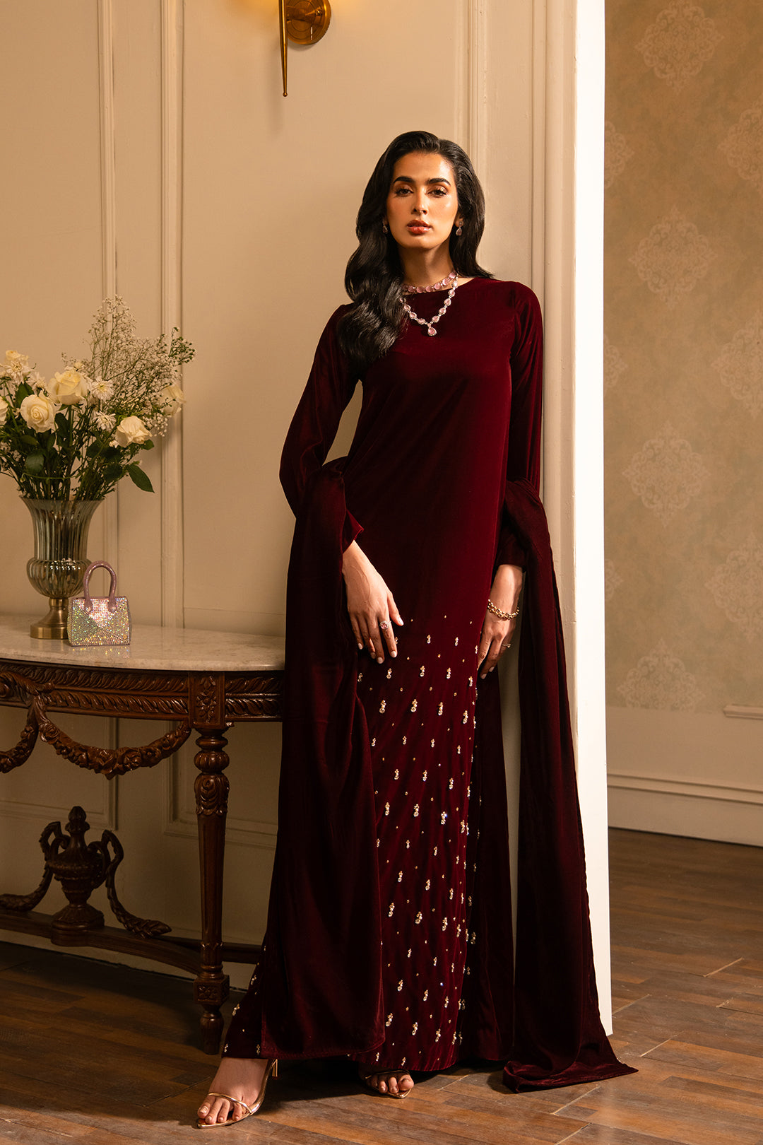 This Stole made in Luxe burgundy velvet fabric is lined with dyed crepe fabric.