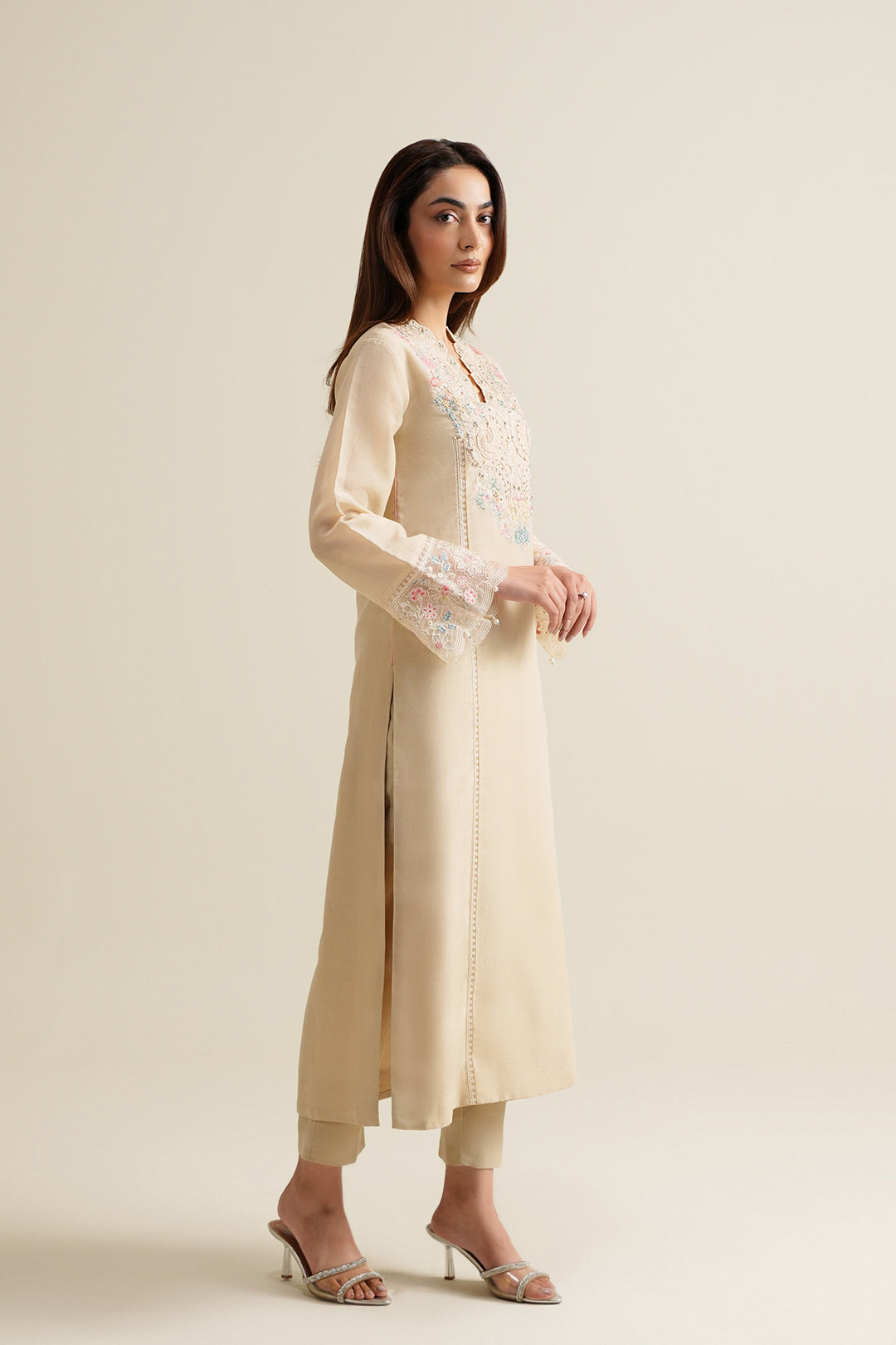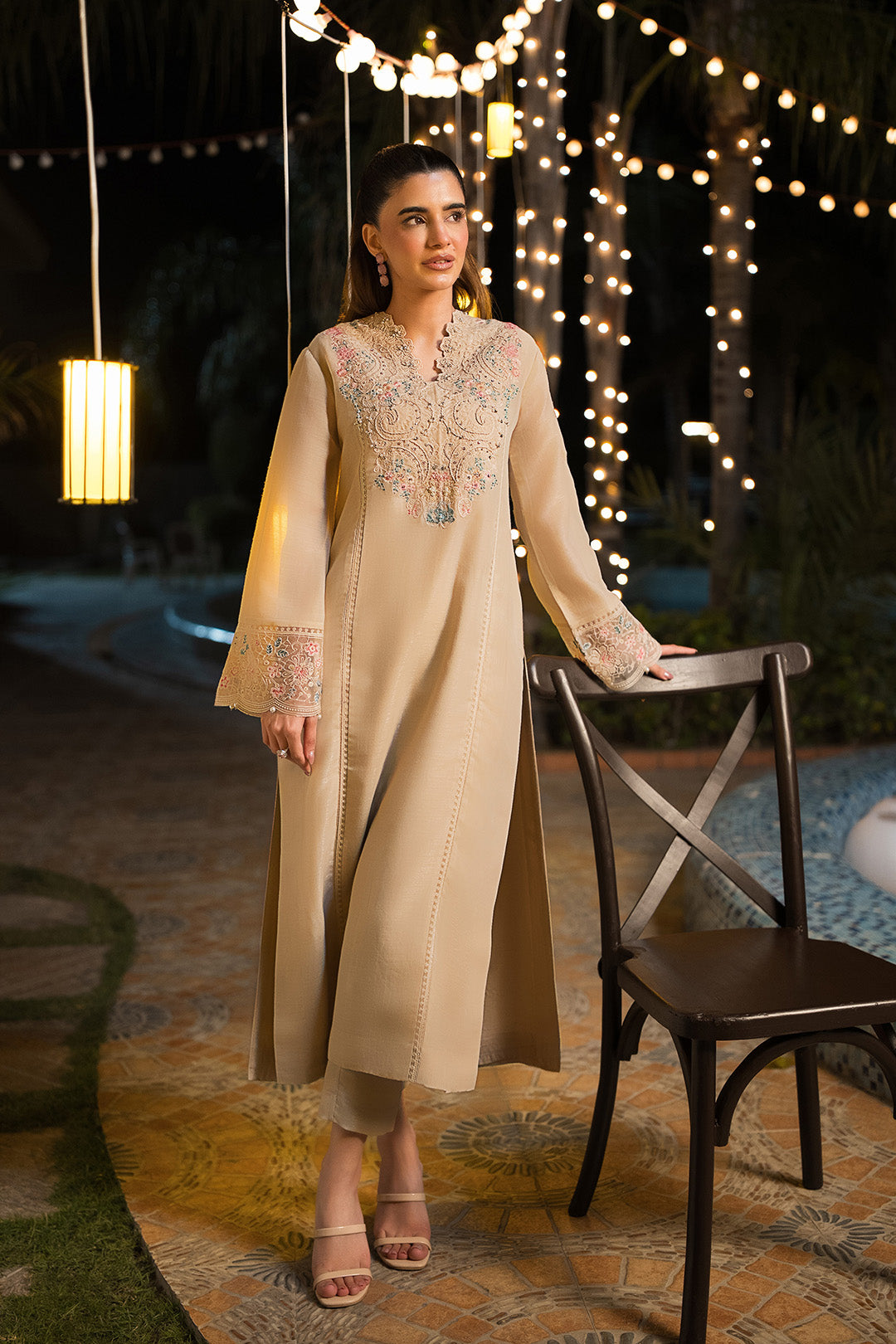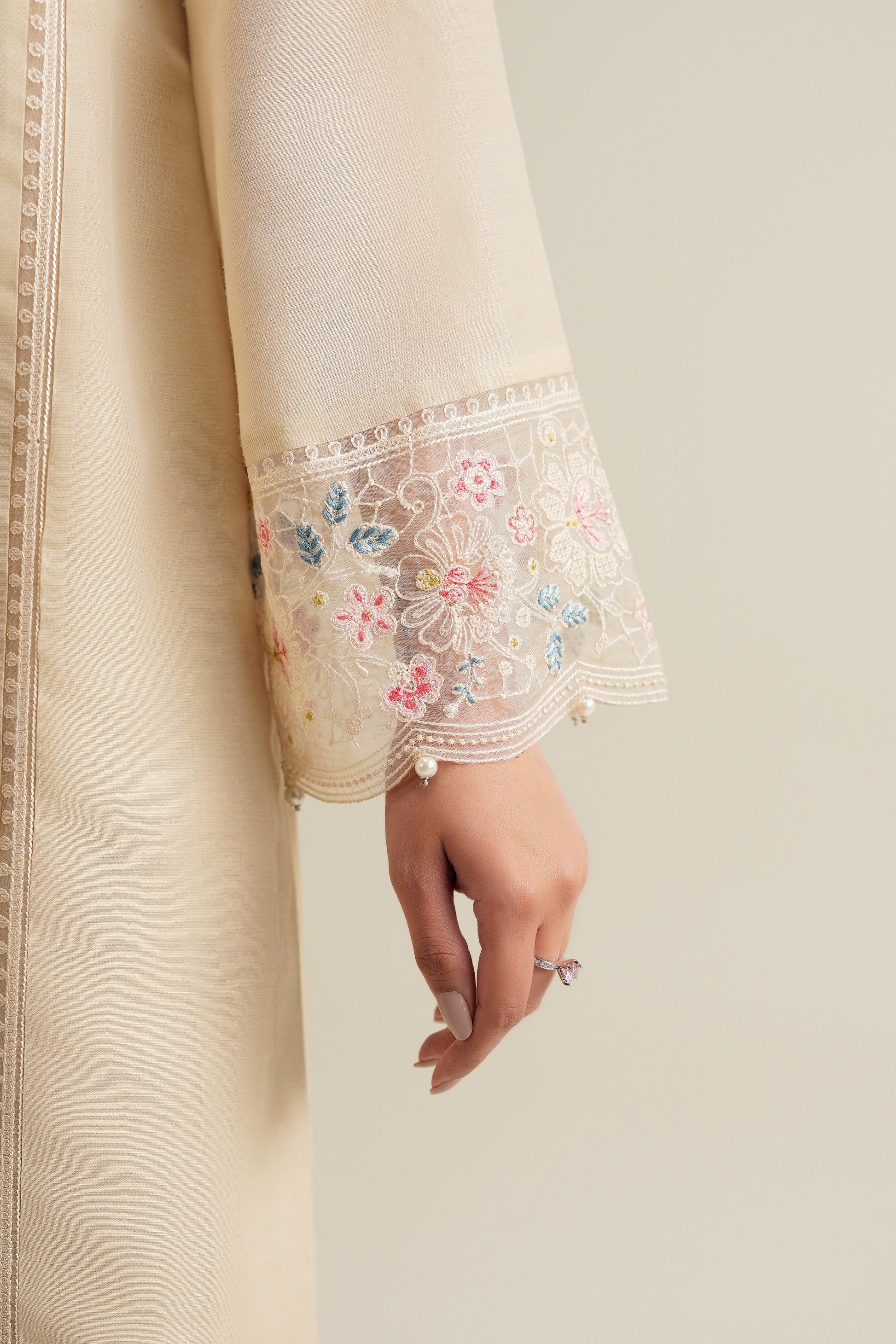 This beige top is made in zari lawn fabric and is lined with viscose fabric. It features a scalloped v-neckline with embellishment and embroidery. It has lace insertion on the front panels, flared sleeves with lace insertion, embroidered cuffs and crystal/pearl hangings along the sleeve opening.