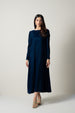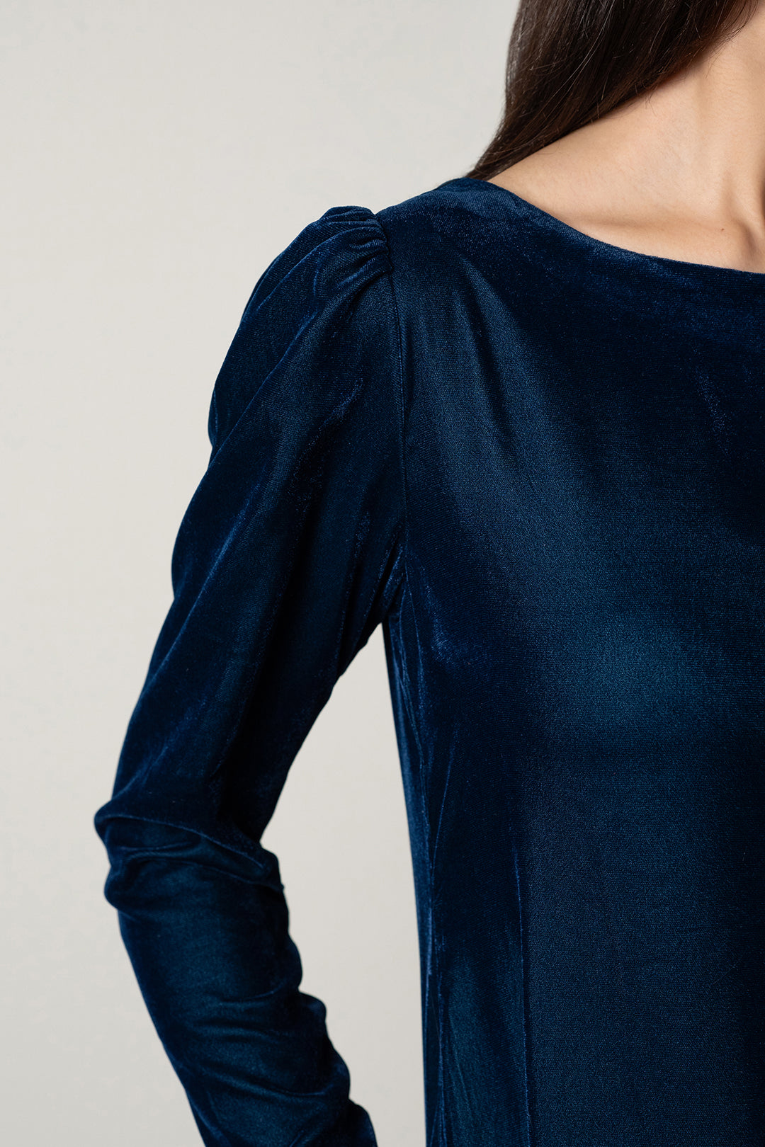 This dress made in soft velvet fabric features boat neck and puffed full length fitted sleeves. This top has side slits and a flared bottom hem.