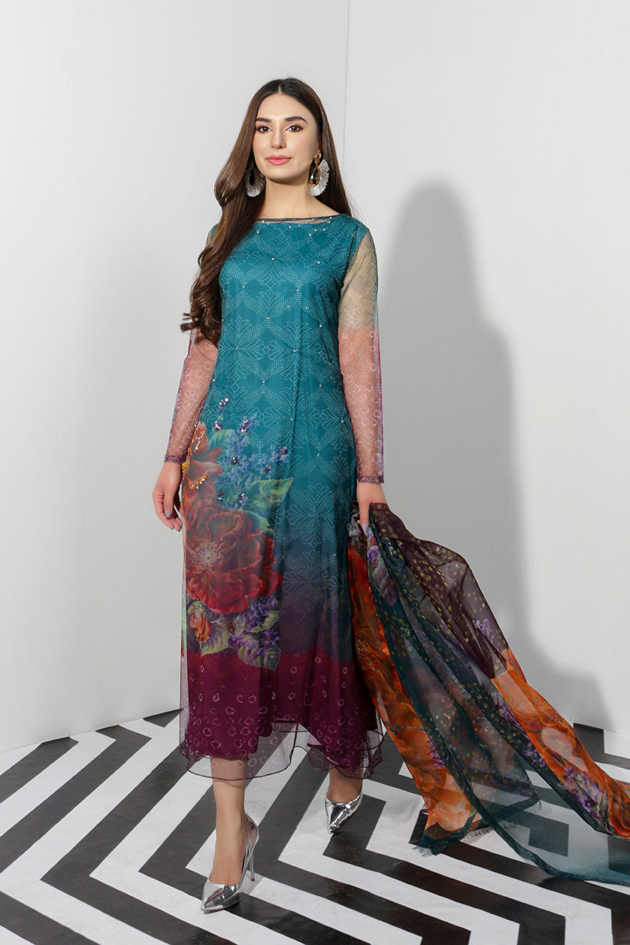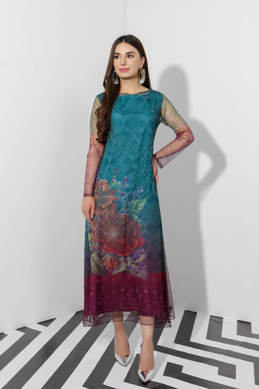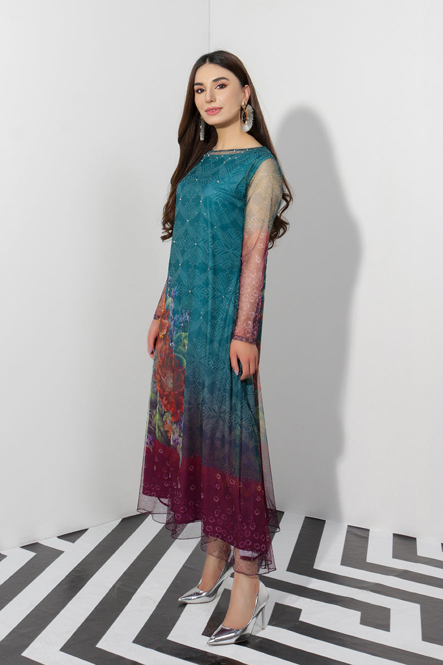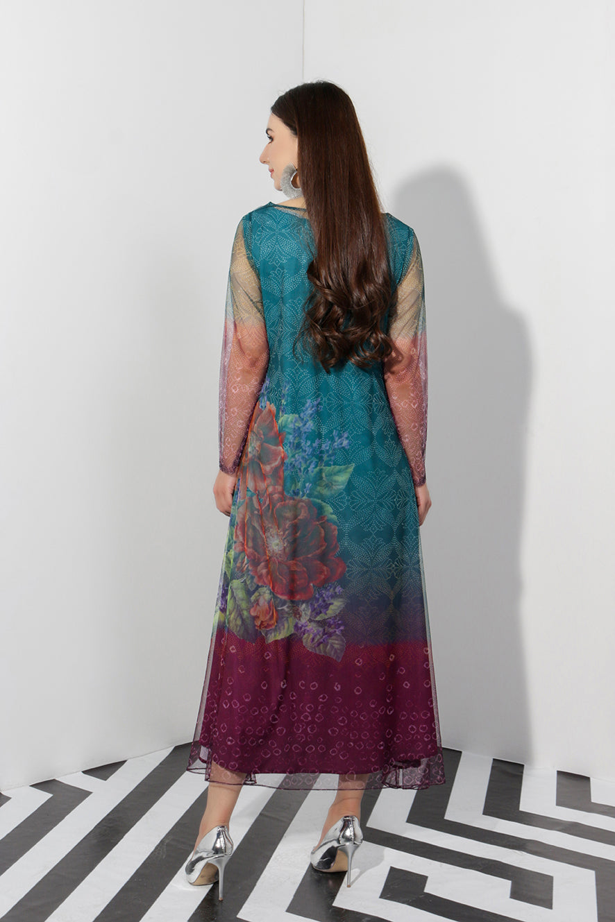 This dress made in sheer net fabric in teal and pink gradient base with florals and chunri print, features tone on tone embellishment, boat neck and full sleeves. Kundol long comes with a sleeveless crepe inner dress in gradient print and extra printed crepe fabric for the sleeves. Length 50". Model is wearing small size. Model height 5'5"