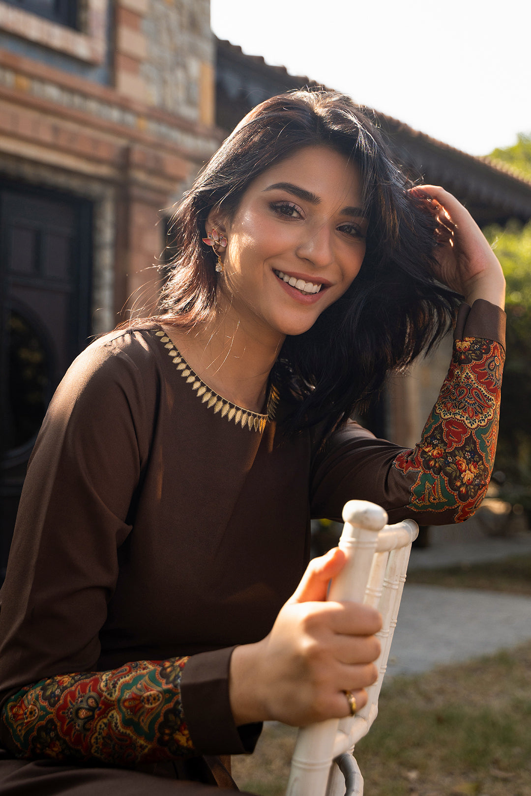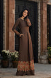 This jumpsuit made in brown soft crepe fabric in ethnic print features embroidered front neckline, crew neck with hook & eye closure at the back, center front pleat with flared bottom, back zipper and full-length sleeves. Length 57". Model is wearing size S. Model height is 5'7"