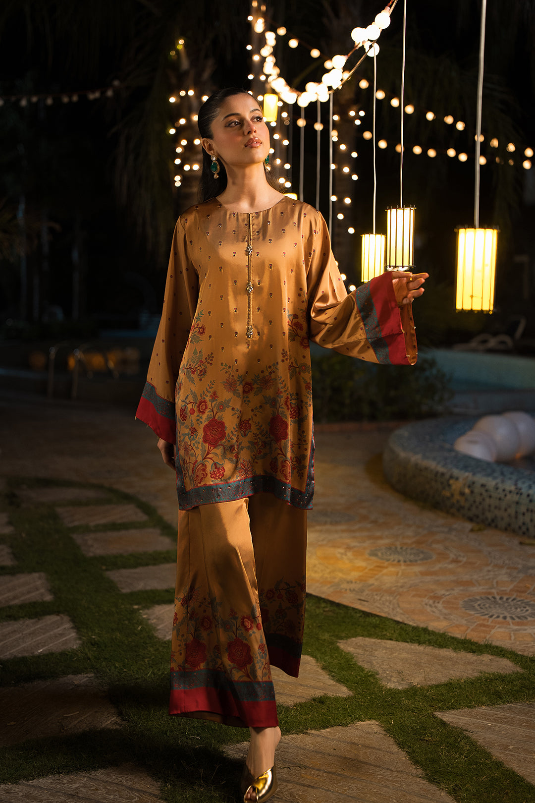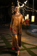 This gold top made in floral printed charmeuse silk fabric features a crew neck with front piping, , hook & eye closure, square armholes , side slits and full-length sleeves with crystal hangings along the sleeve opening.