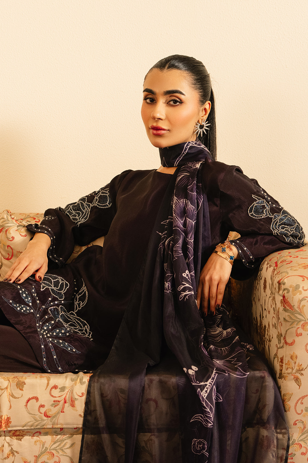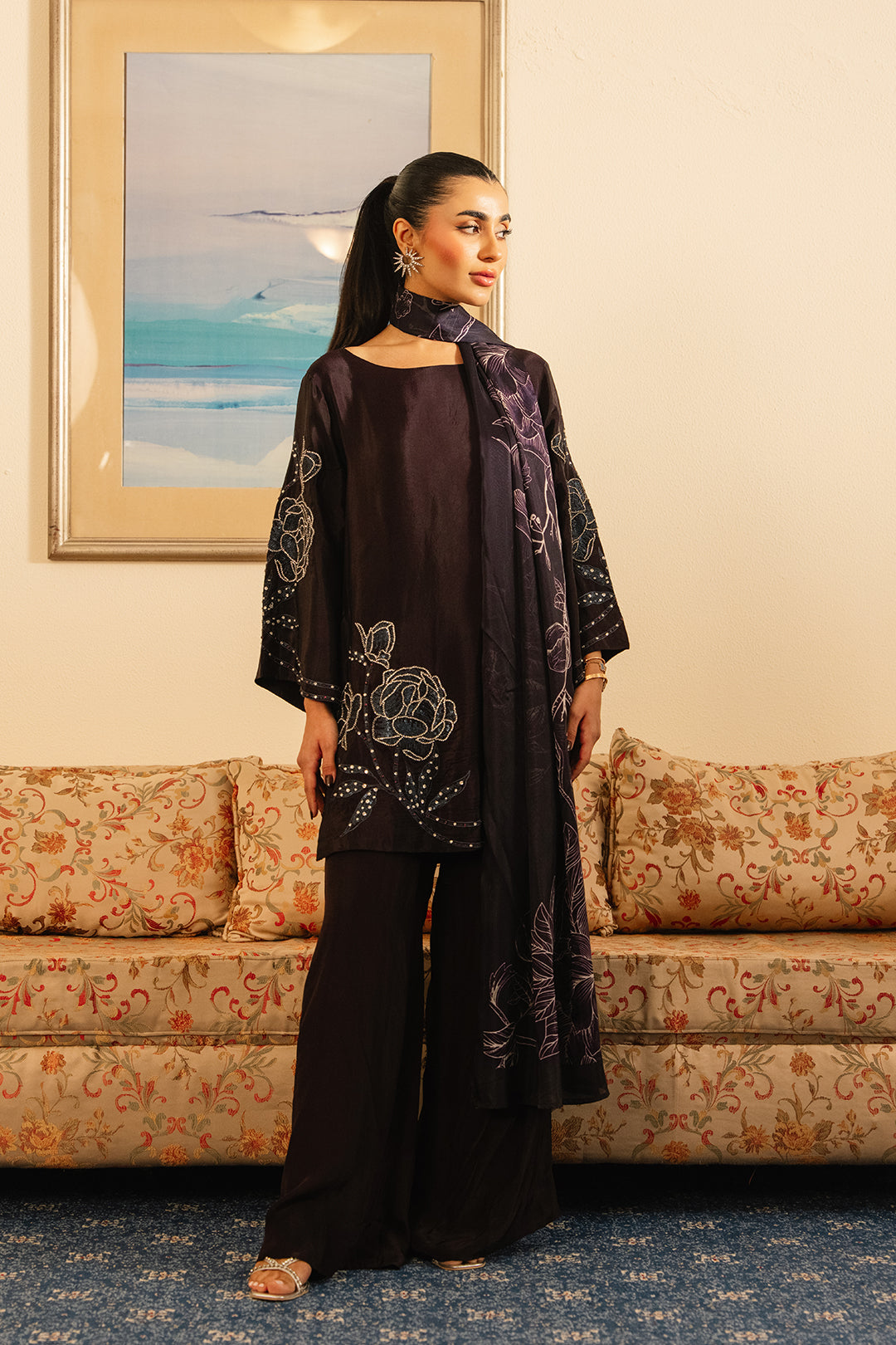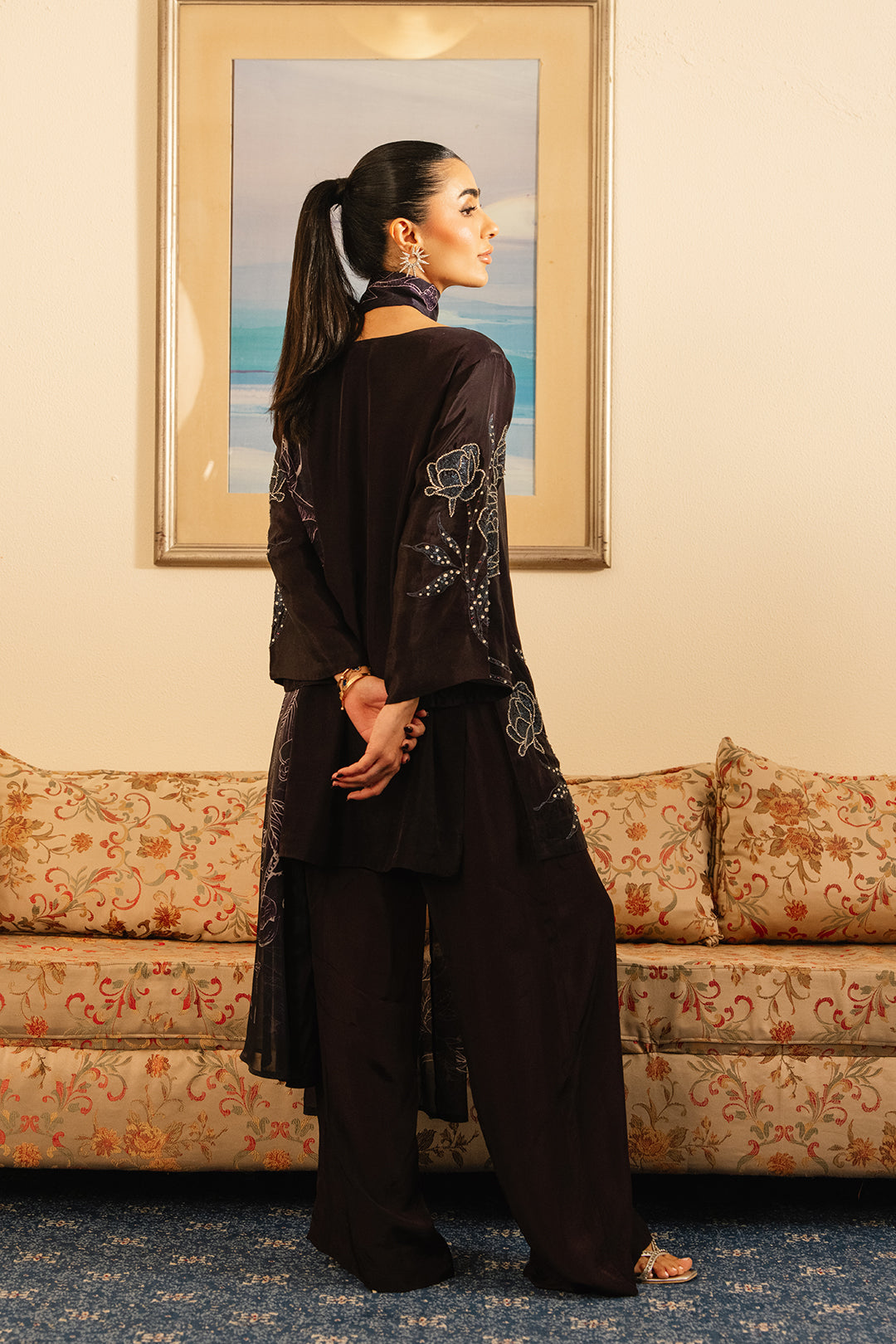 This deep purple silk short shirt features silver and purple embellishments on shirt front and sleeves. Flared sleeves and a boat neckline tie in simplicity with festivity. Pair with "Laroze Dupatta" and "Laroze Pants" to complete the look.