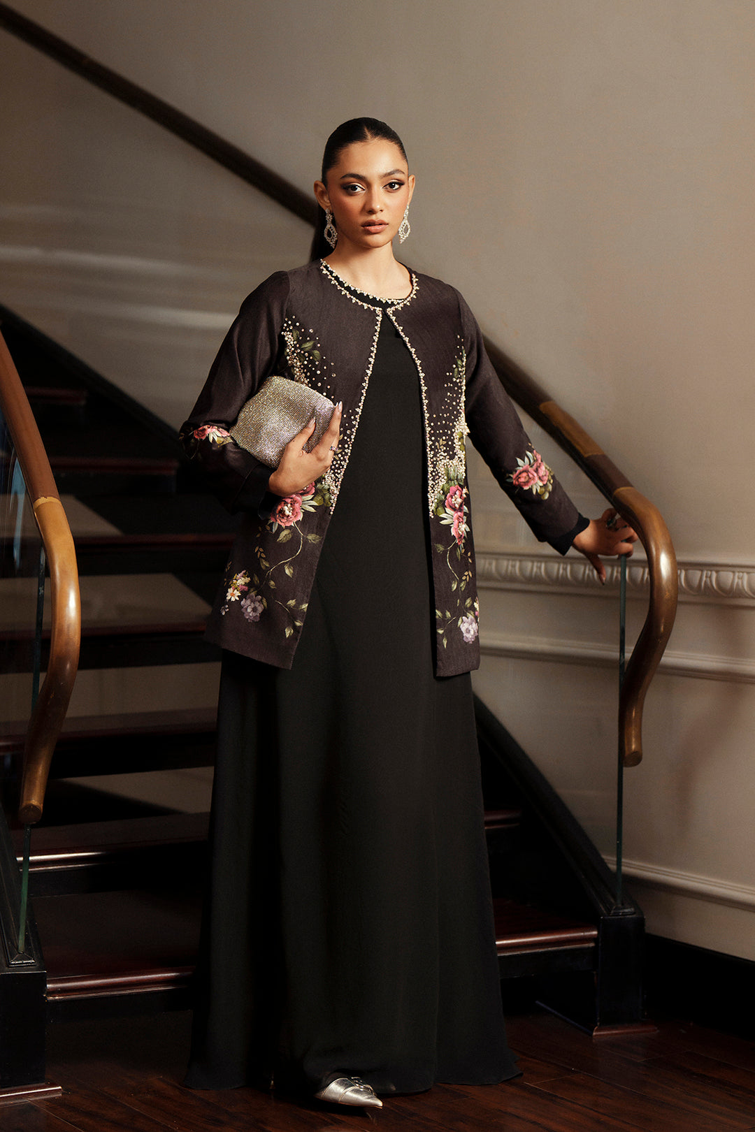 • This printed velvet floral jacket is a statement. Front open with an embellished neckline, this jacket is heavily embellished with crystals and pearls. Pair with "Layaan Dress" to complete the look.