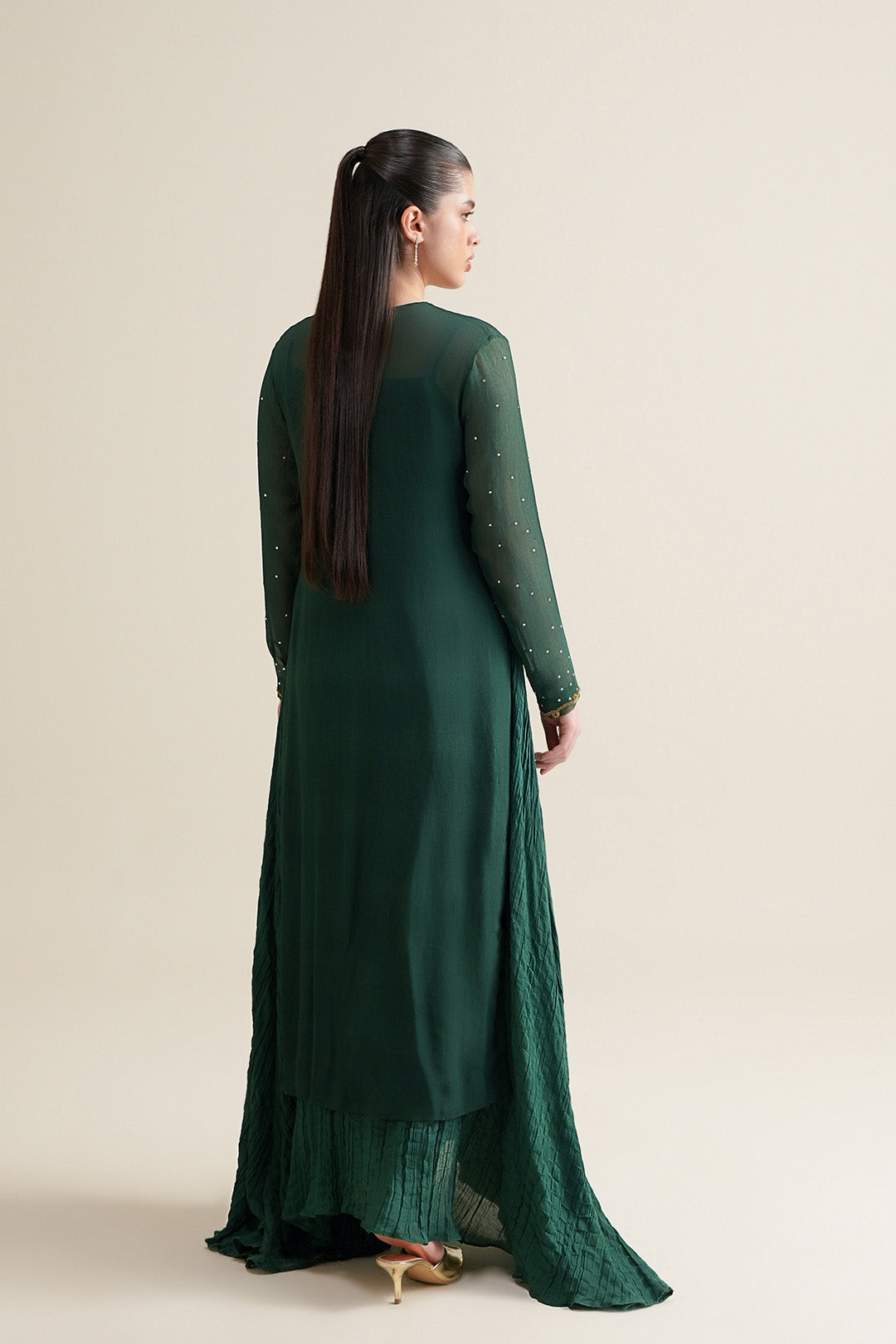 This Sadabahar chiffon dress features a V-neckline with organza insertion and is complemented by delicate embellishment for a refined touch. It has full-length sleeves with subtle embellishments, pearl detailing along the side seams. Styled with crushed dress, it offers a contemporary and elegant silhouette.