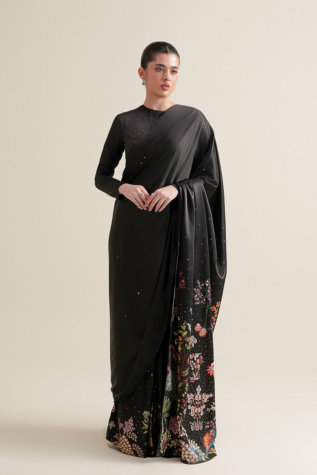 This foil-printed charmeuse silk saree is tailored with fixed front pleats and hook-and-eye for adjustable closure, offering a refined drape. It is paired with a viscose petticoat featuring an elasticated waist belt and flared silhouette to ensure all-day comfort and ease of movement.