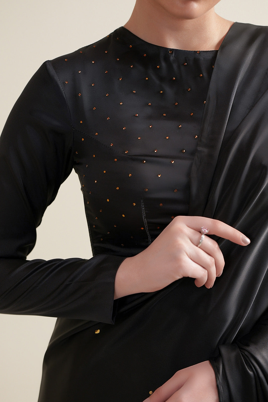 It is paired with charmeuse silk crop top featuring a crew neckline with back neck slit and full length sleeves. Tailored with darts, a side zipper for flawless fit. It is beautifully enhanced with subtle front embellishment.